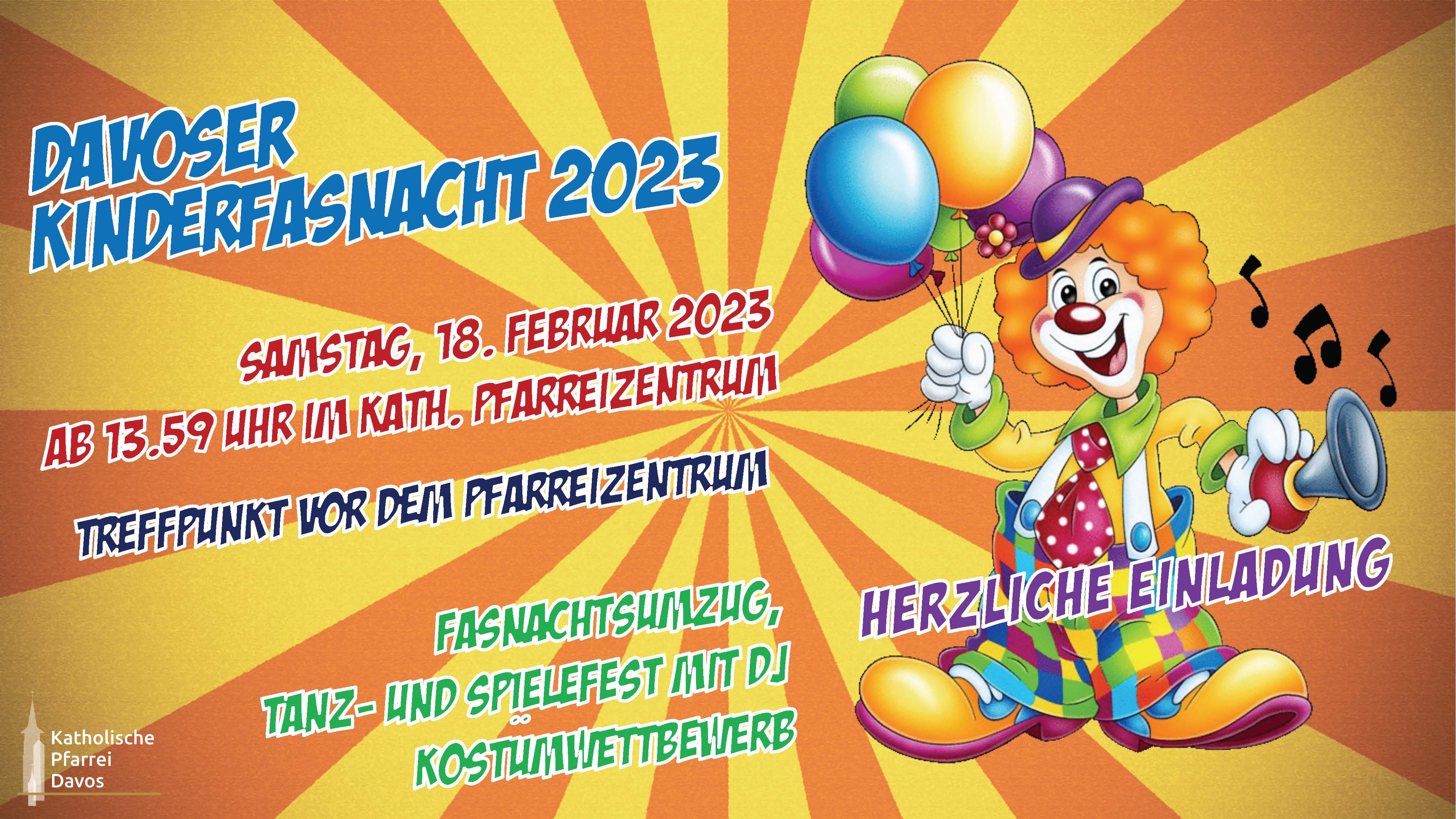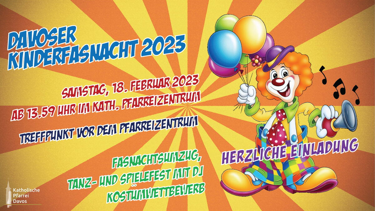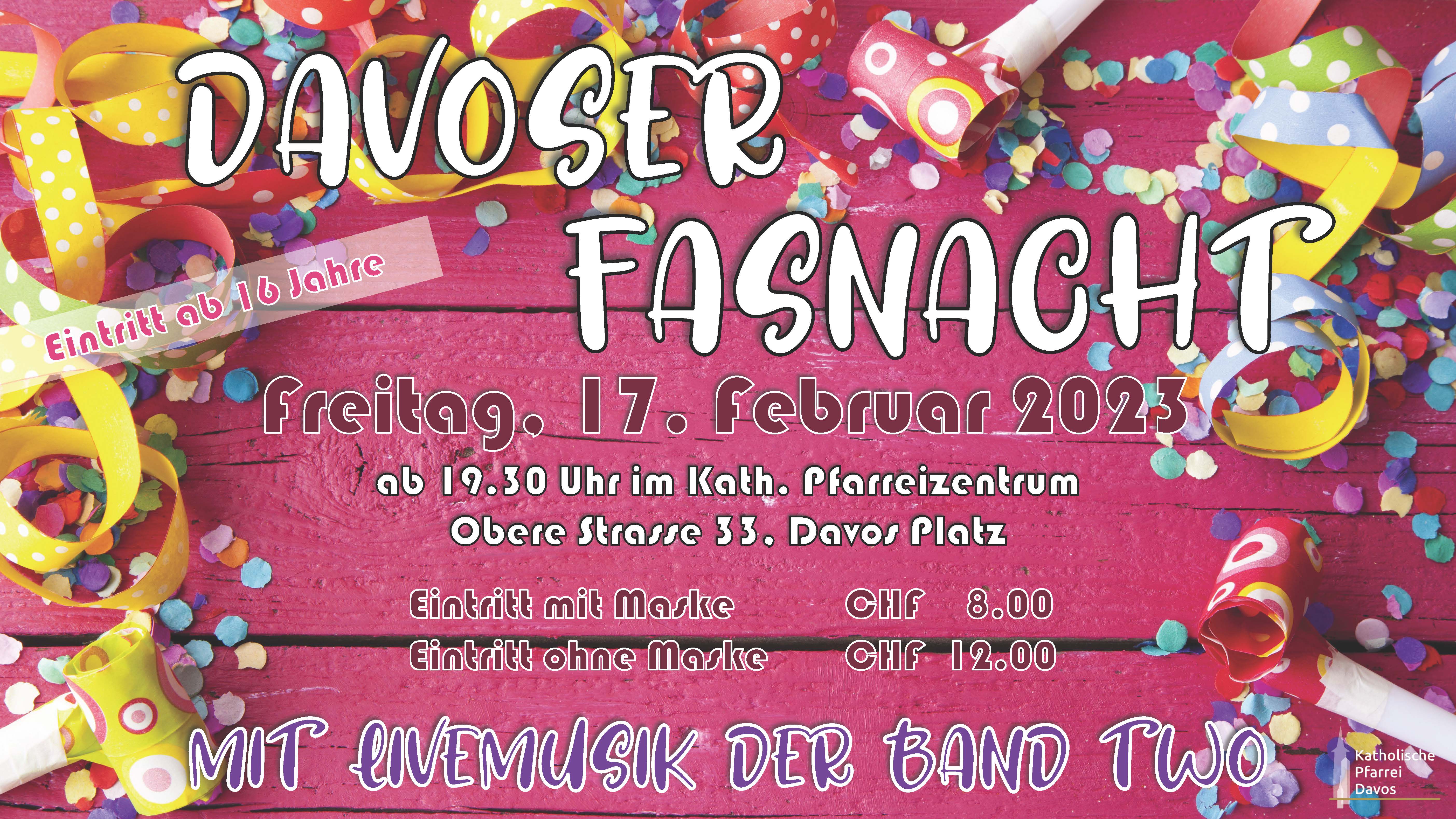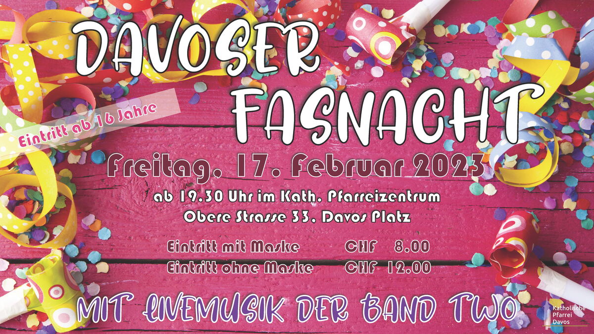 „Wer nichts mehr zu Lachen hat, dem ist das Lachen vergangen“. Nach Coronazwangspause freuen wir uns riesig auf die traditionelle Davoser Fasnacht mit LIVE-Band und Barbetrieb ab 16 Jahren und die Davoser Kinderfasnacht. Alt und Jung, Gross und Klein, Dick und Dünn, Katholisch und Reformiert, oder: ALLE sind herzlich willkommen. Wer nicht kommt - ist selber schuld!