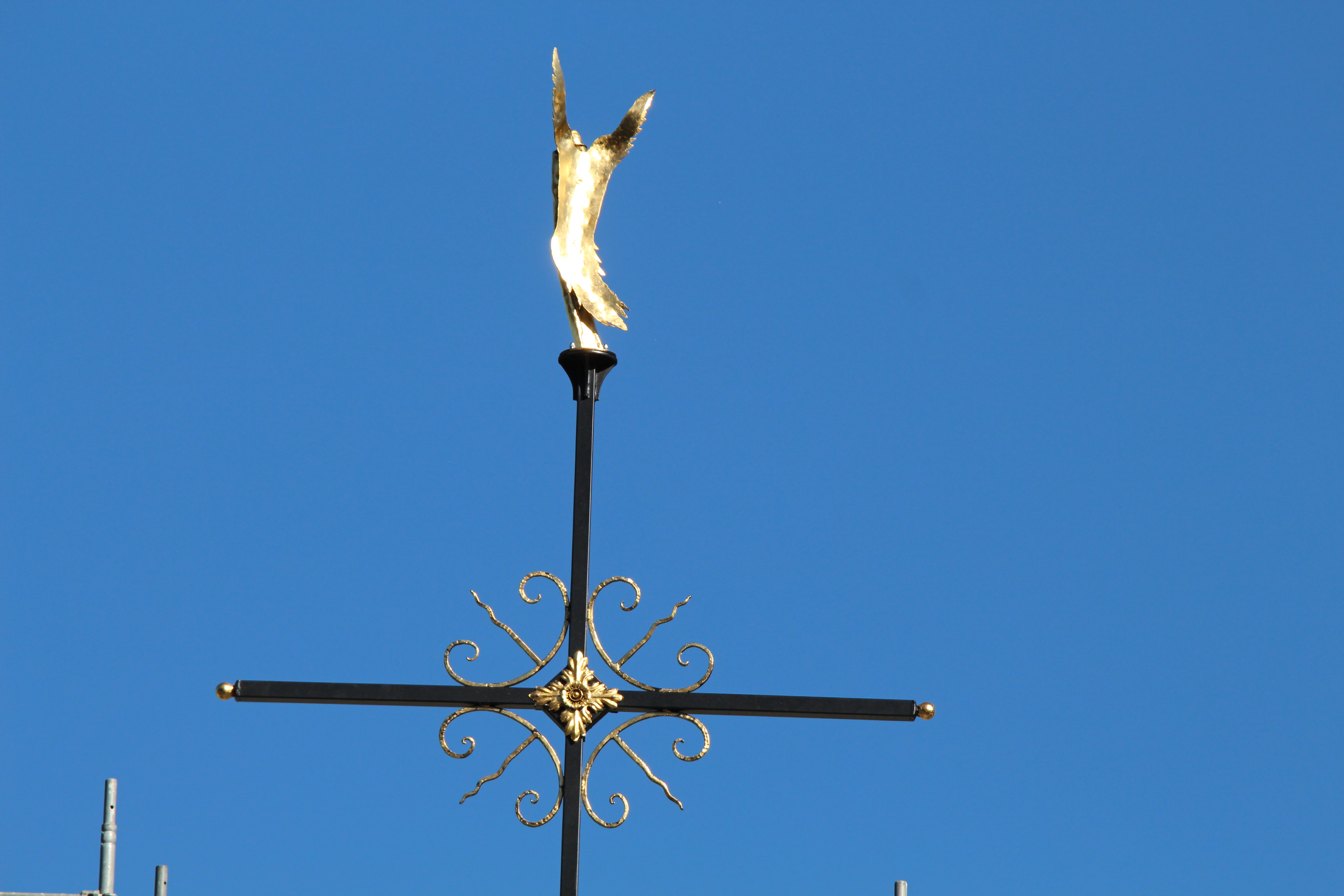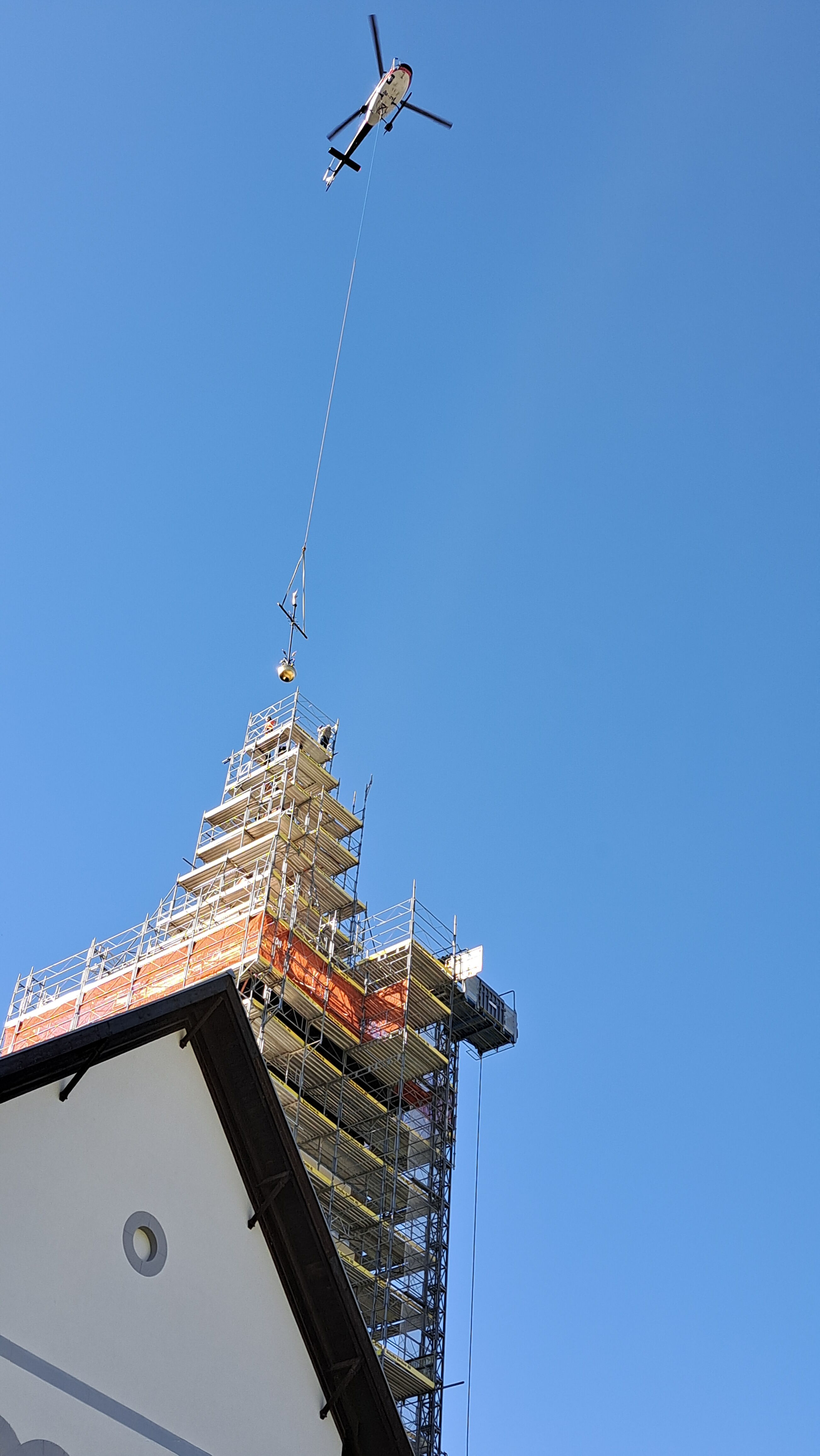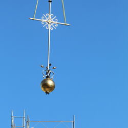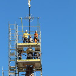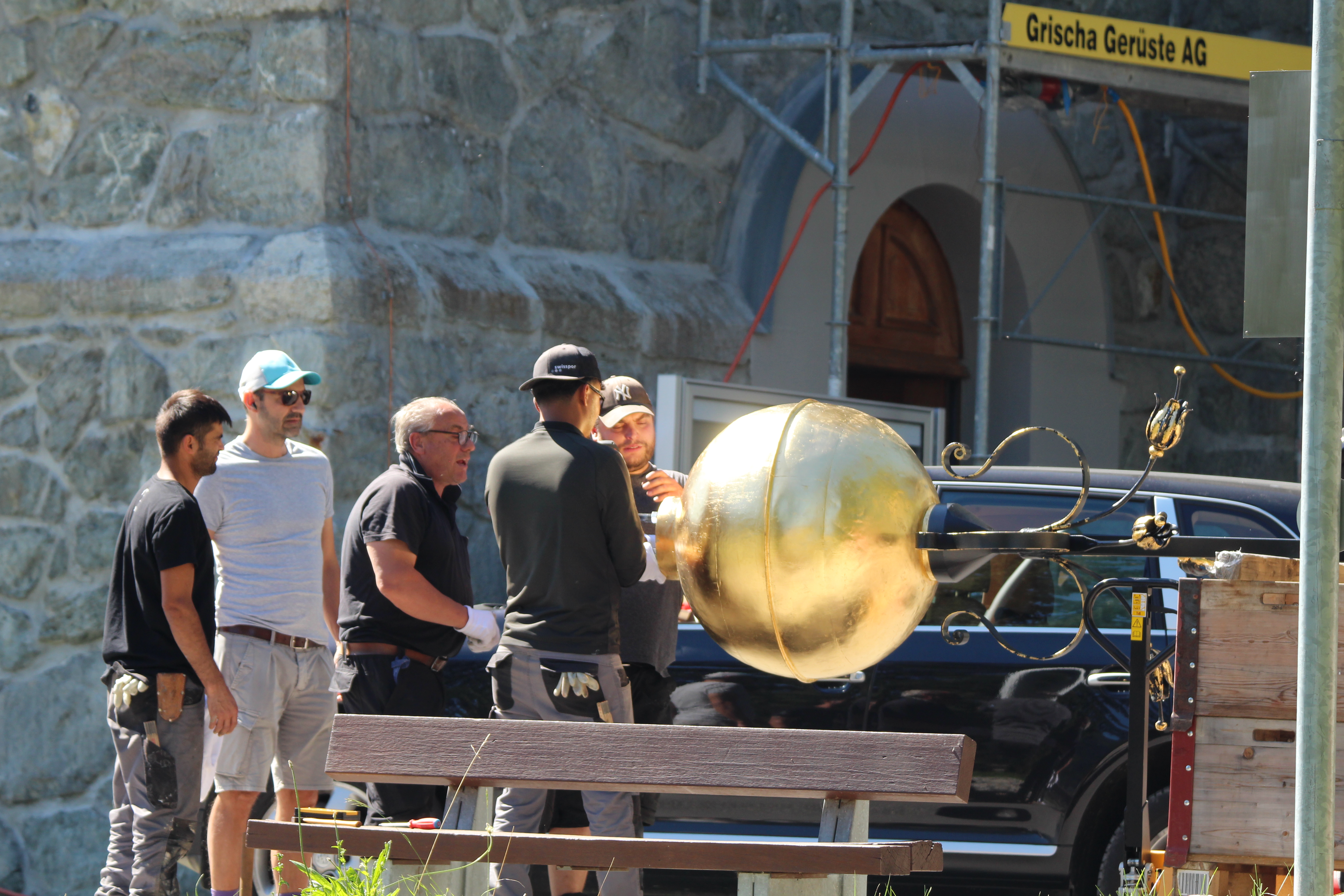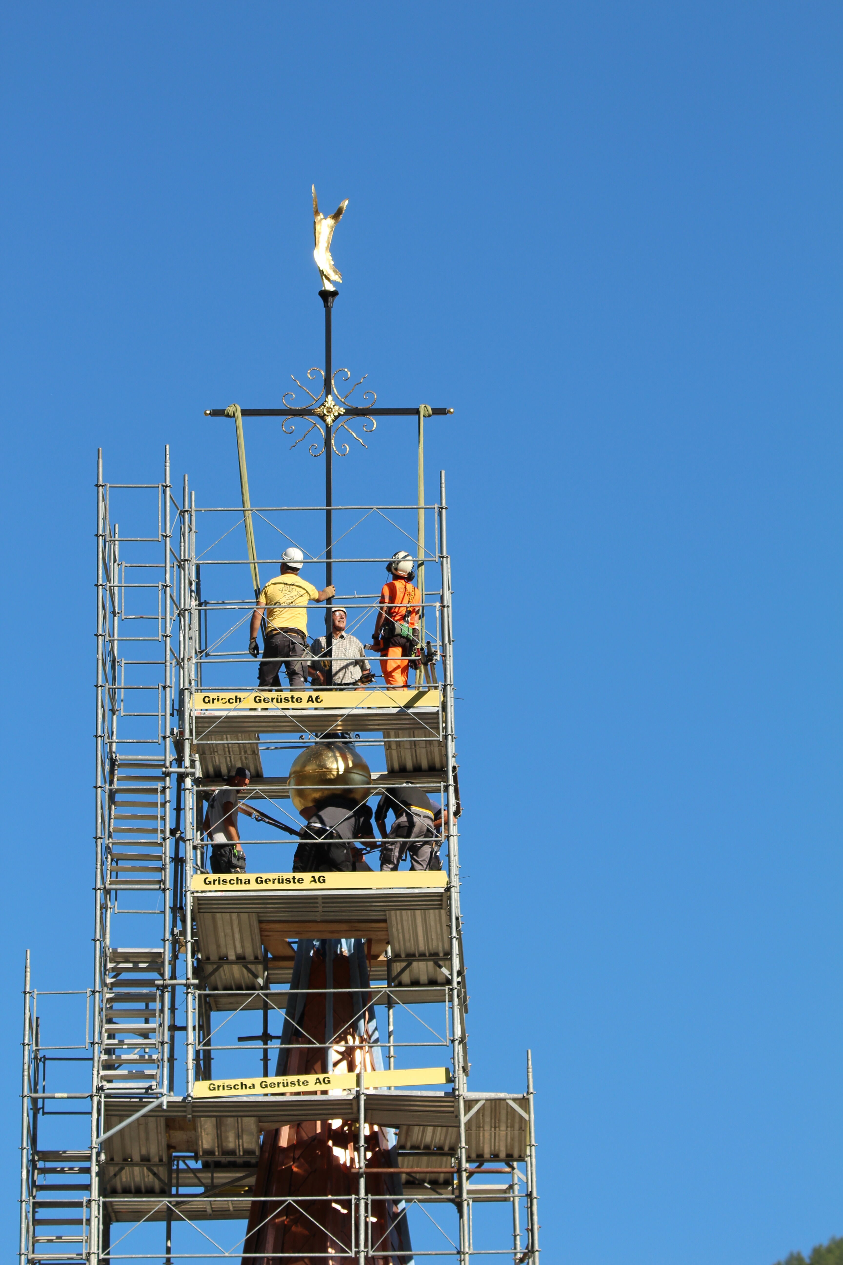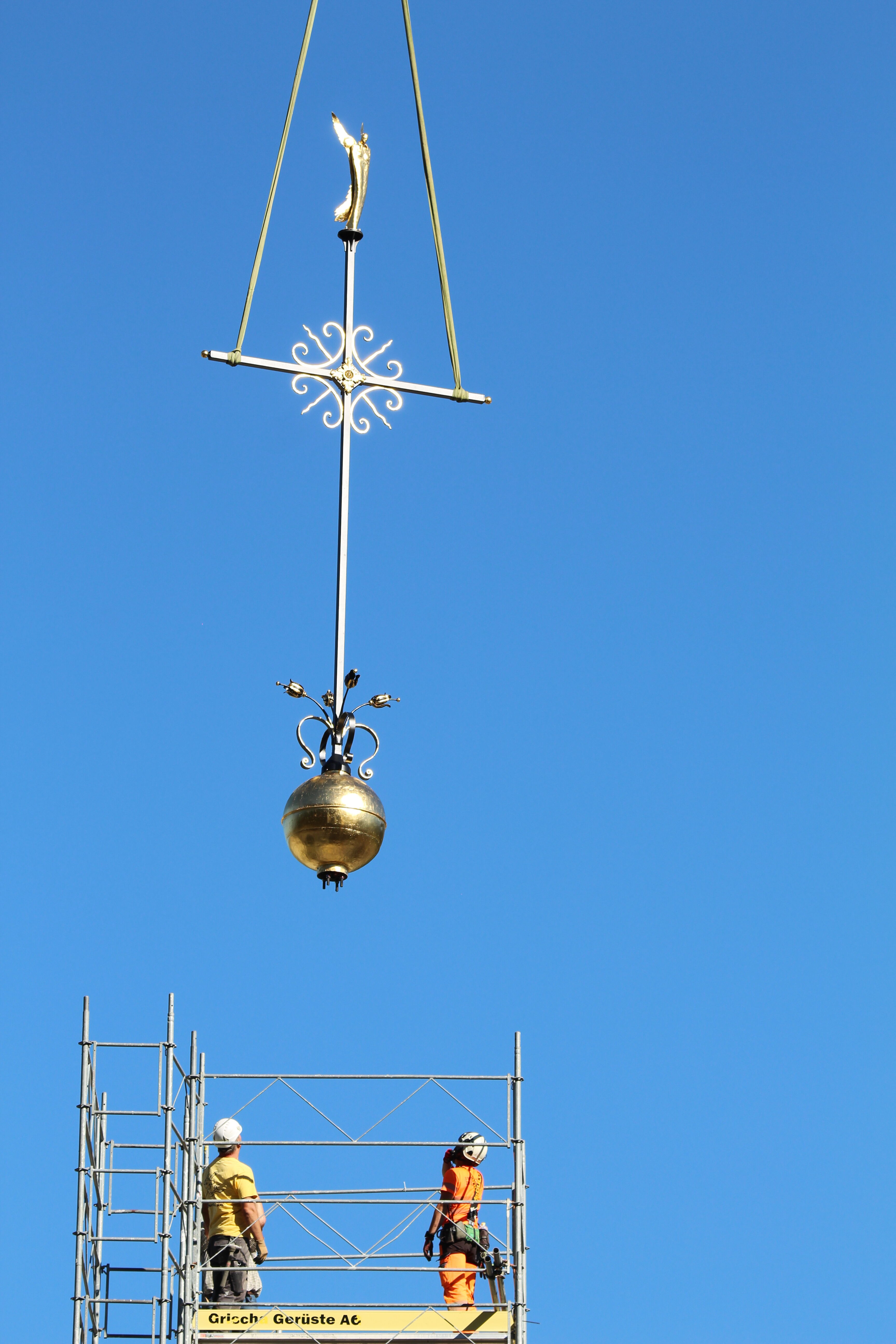 Am vergangenen Mittwoch fand mit dem Anbringen des Kreuzes auf dem Turm der katholischen Marienkirche der letzte grosse symbolische Akt der laufenden Renovationsarbeiten statt. Im Zuge der Turmsanierung, die diesen Sommer erfolgte, wurde das alte Kreuz inklusive Kugel und Wetterhahn entfernt. «Insbesondere Carlo Minelli investierte viel Arbeit in die Instandstellung des Turmaufbaus. Dabei wurde die Kugel mit Blattgold vergoldet, das Kreuz neu angefertigt, und der Wetterhahn wurde durch eine Figur des Erzengels Michael ersetzt», erzählt Michael Segessenmann, Leiter des Pfarrsekretariats. Beim Auseinandernehmen des alten Kreuzes habe ich gezeigt, dass dieses im Innern zu rosten begonnen habe und ein Ersatz deshalb der richtige Schritt war. «Solche Schäden sieht man aber erst, wenn man die Konstruktion auseinandernimmt.» In der Kugel befinde sich auch wieder eine Zeitkapsel, in der verschiedene historische und zeitgenössische Dokumente für die Nachwelt aufbewahrt werden. Parallel zu diesen Arbeiten wurde auch am Turm selbst viel gearbeitet (siehe DZ vom 15. Juni). So wurde der Holzstamm, auf dem das Kreuz montiert gewesen sei, mit einem sogenannten «Schuh» ummantelt. So soll gemäss Segessenmann verhindert werden, dass Wasser in die Holzkonstruktion eindringe. Denn genau dies sei in der Vergangenheit passiert.