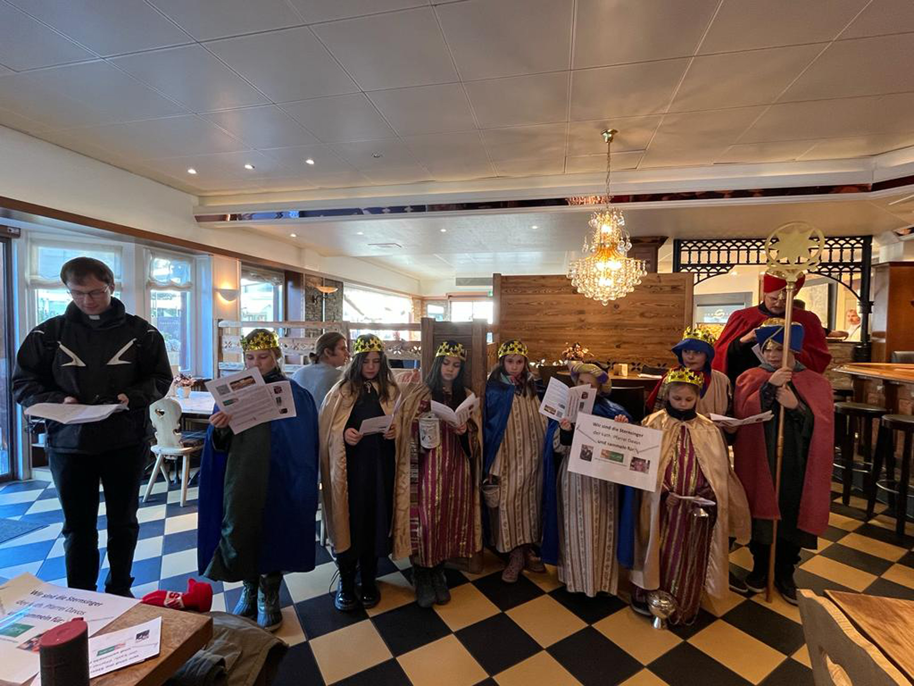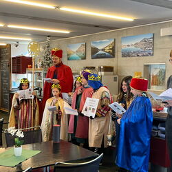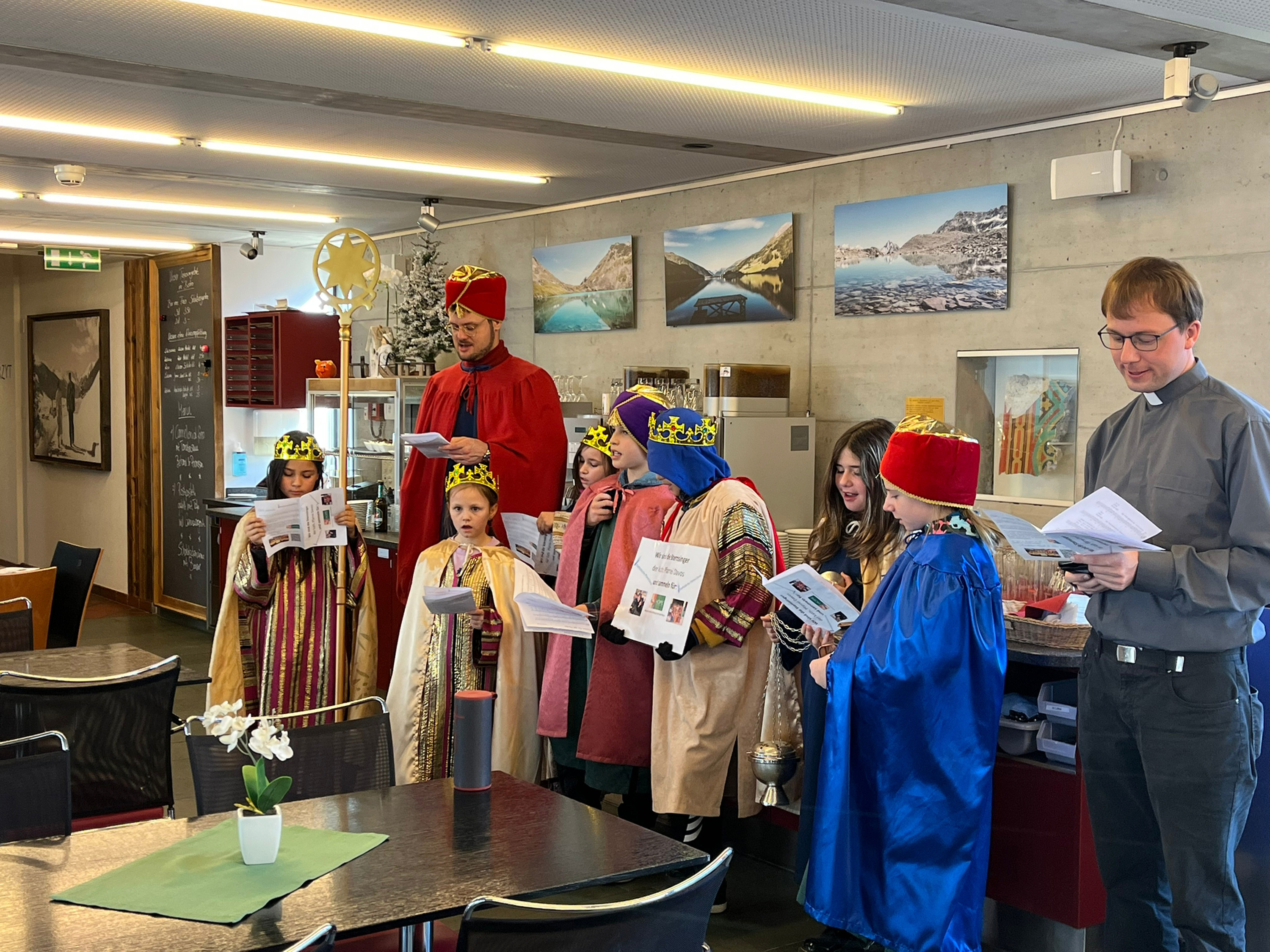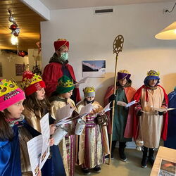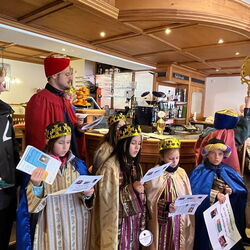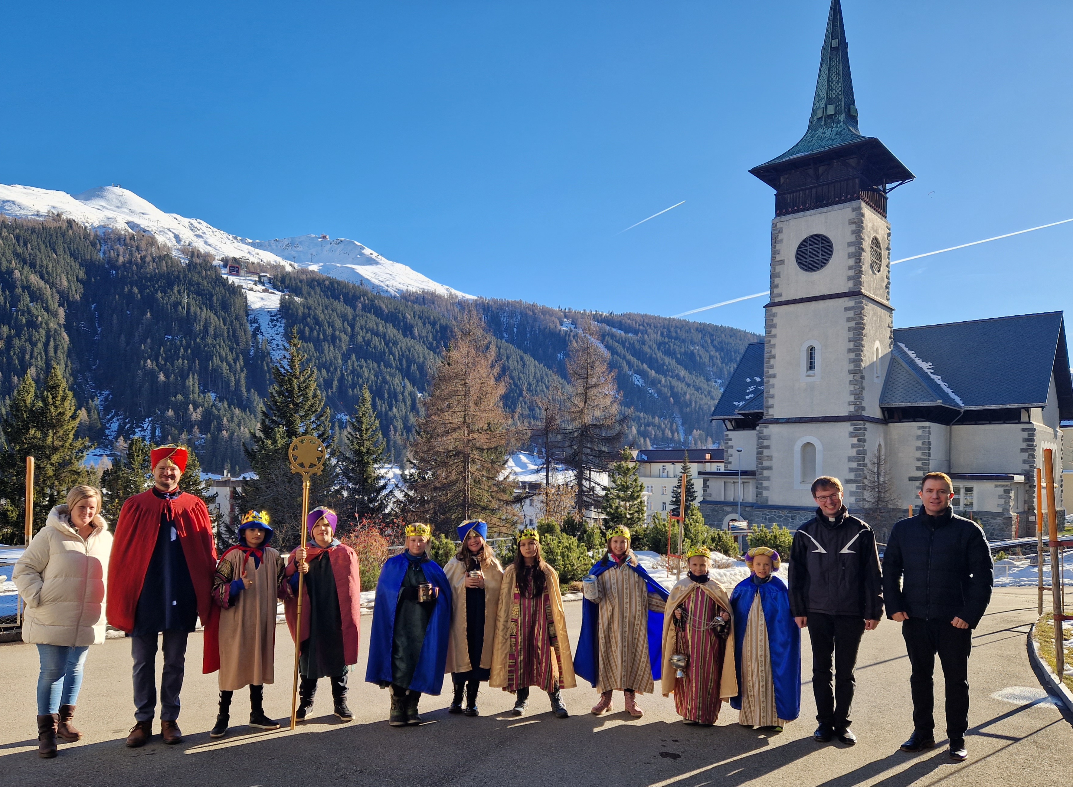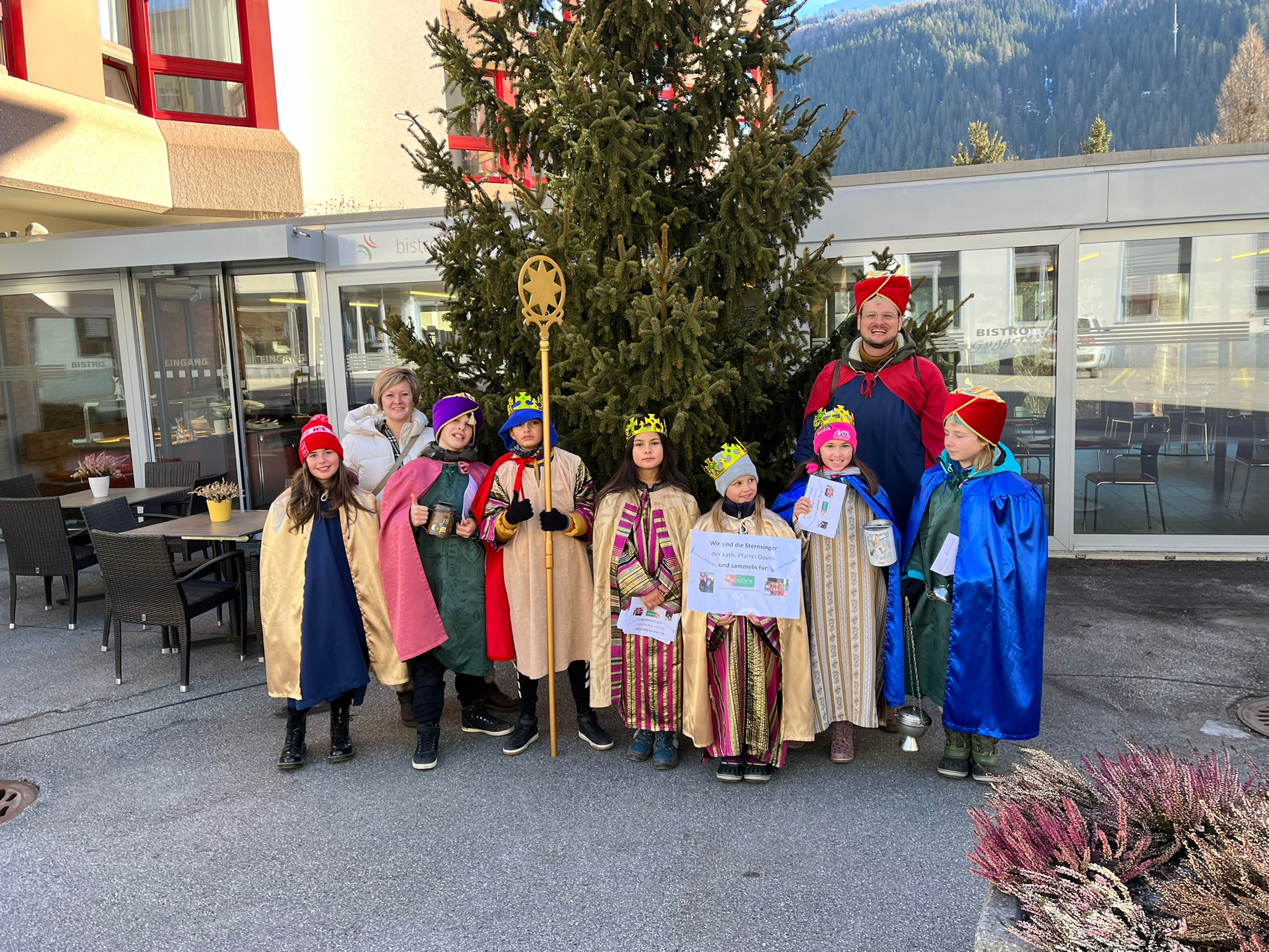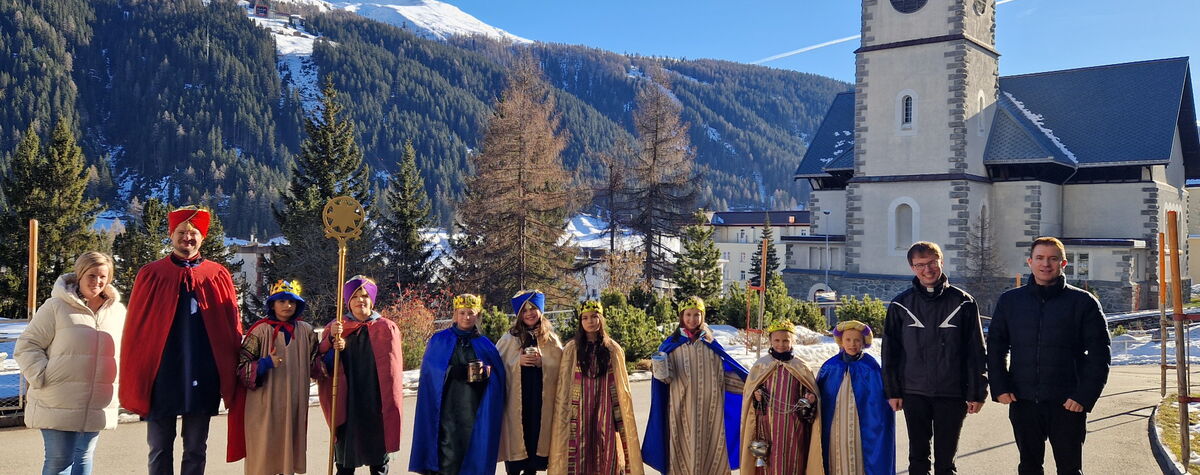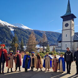 Am vergangenen Wochenende, dem 8.und 9. Januar 2023, beteiligten sich zahlreiche Kinder und Jugendliche der katholischen Pfarrei Davos, um bei der weltweit grössten Solidaritätsaktion unter dem Motto «Kinder helfen Kindern» dabei zu sein. Als Heilige Dreikönige «Caspar, Melchior und Balthasar» verkleidet, machten sich die eifrigen Sternsinger auf den Weg durch Davos, um mit Liedern und Gedichten Gottes Segen für ein gutes neues Jahr 2023 zu wünschen. Ob im Zentrum Guggerbach, im Pflegeheim oder Spital, in Geschäften, Hotels und auf öffentlichen Davoser Plätzen: überall wurde das Engagement der Sternsinger mit Freude aufgenommen. So verbreitete sich am Dreikönigsfest nochmals weihnachtliche Stimmung - auch bei den Festmessen in der Marien- u. Herz-Jesu-Kirche. Der schöne Spendenerlös von etwa CHF 2500 geht an die Kinderhilfe «Hope» Nepal. Gesegnete Segensaufkleber sowie Weihrauch und Dreikönigswasser können die kommenden Tage noch in den Kirchen mitgenommen werden. Ein herzliches Dankeschön gilt allen Spendern sowie den fleissigen Ministranten, die trotz Ferien etwas von ihrer Zeit für die gute Tat geschenkt haben.