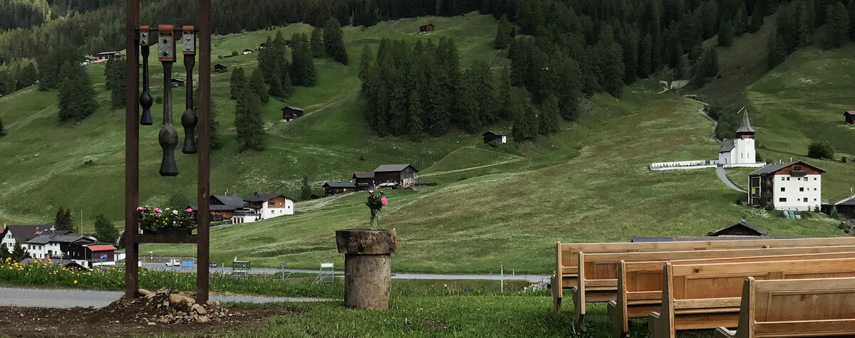 Glücklicherweise hat der Davoser Künstler Andreas Hofer eine wohl einmalige „Kircheninstallation im Freien“, bestehend aus alten Kirchenbänken, mit Platz für über 150 Gottesdienstbesucher, in Davos Frauenkirch gestaltet.