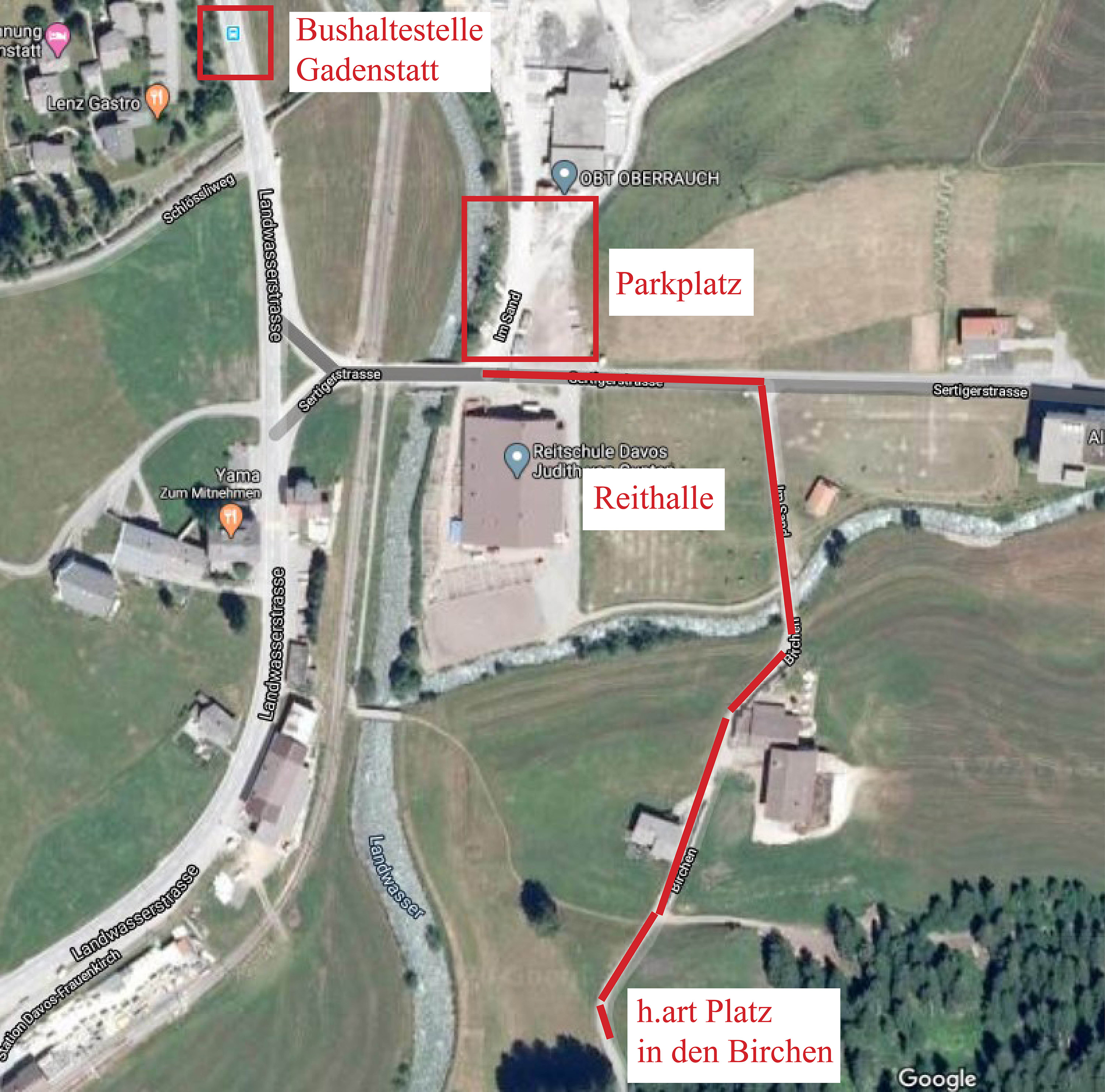 Der sogenannte h.art Platz oder auch Platz in den Birchen in Frauenkirch, befindet sich oberhalb der Reithalle Frauenkirch. Kommen Sie bitte mit dem Bus zur Busstation Gadenstatt oder mit dem Auto zum Parkplatz vor dem Kieswerk, dann geht es zu Fuss auf der Strasse zum Junkerboden (ca. 6 min). Betagte Personen können mit dem Auto hochgefahren werden. Das Auto danach bitte auf dem erwähnten Parkplatz abstellen.