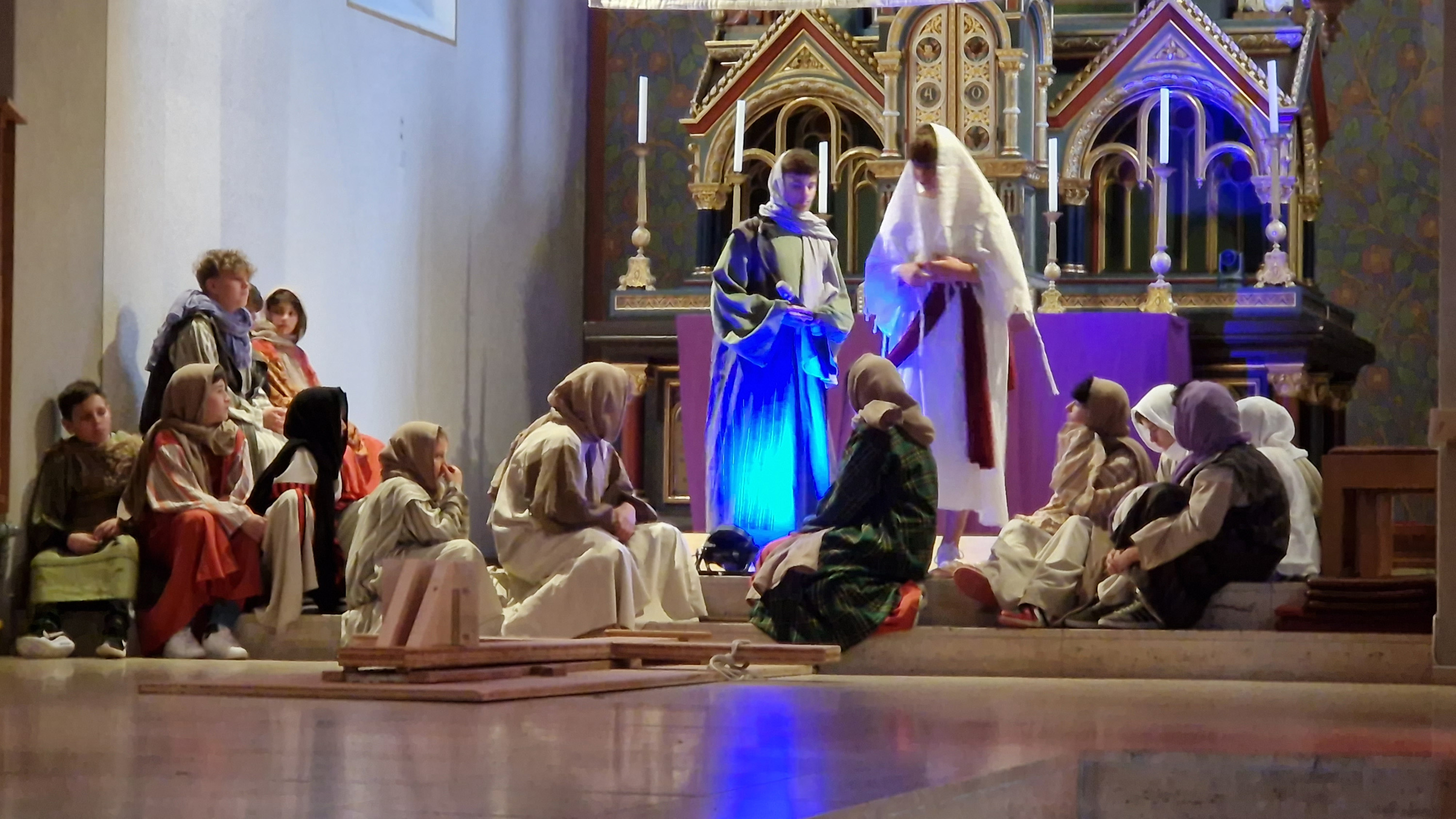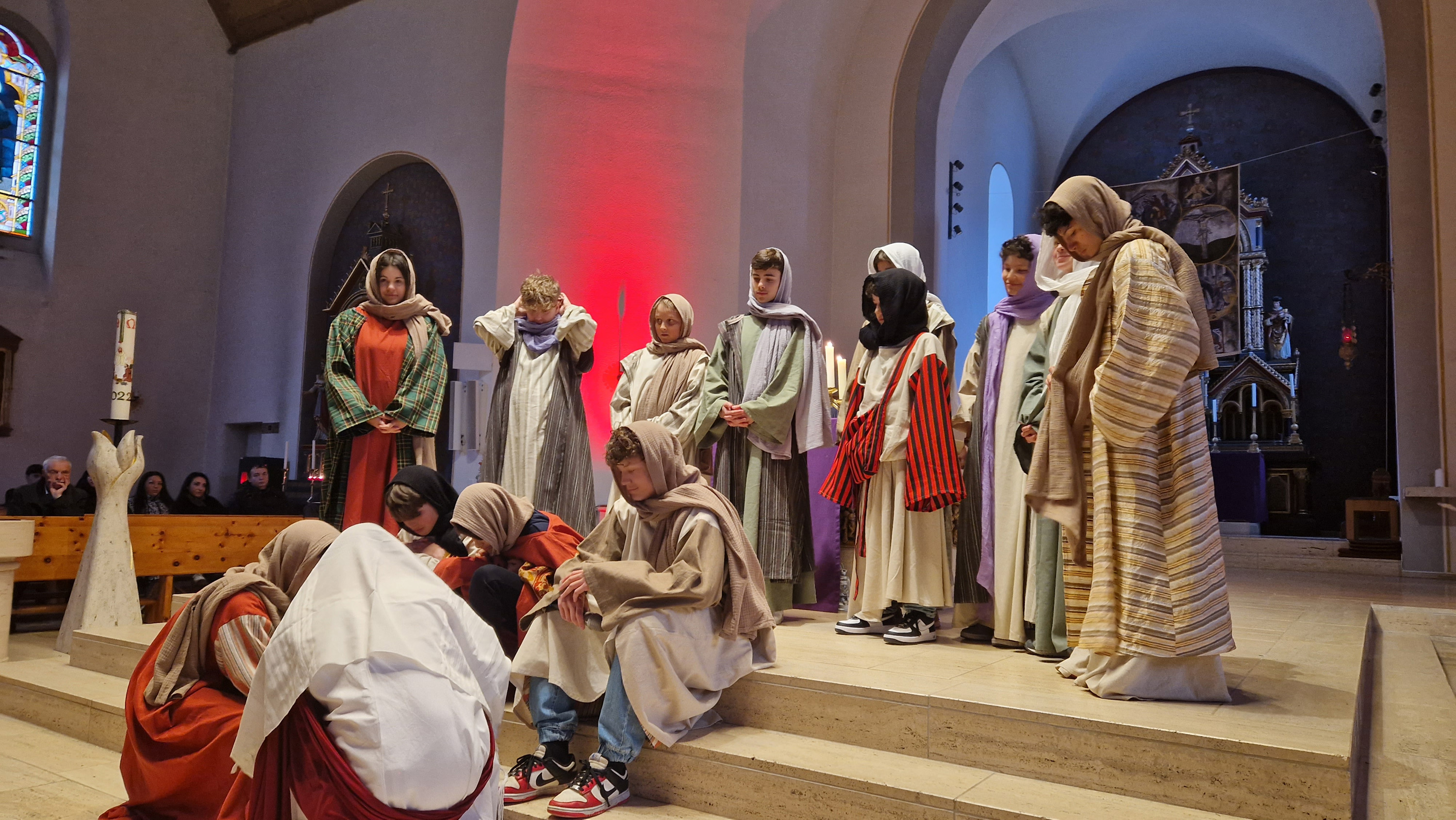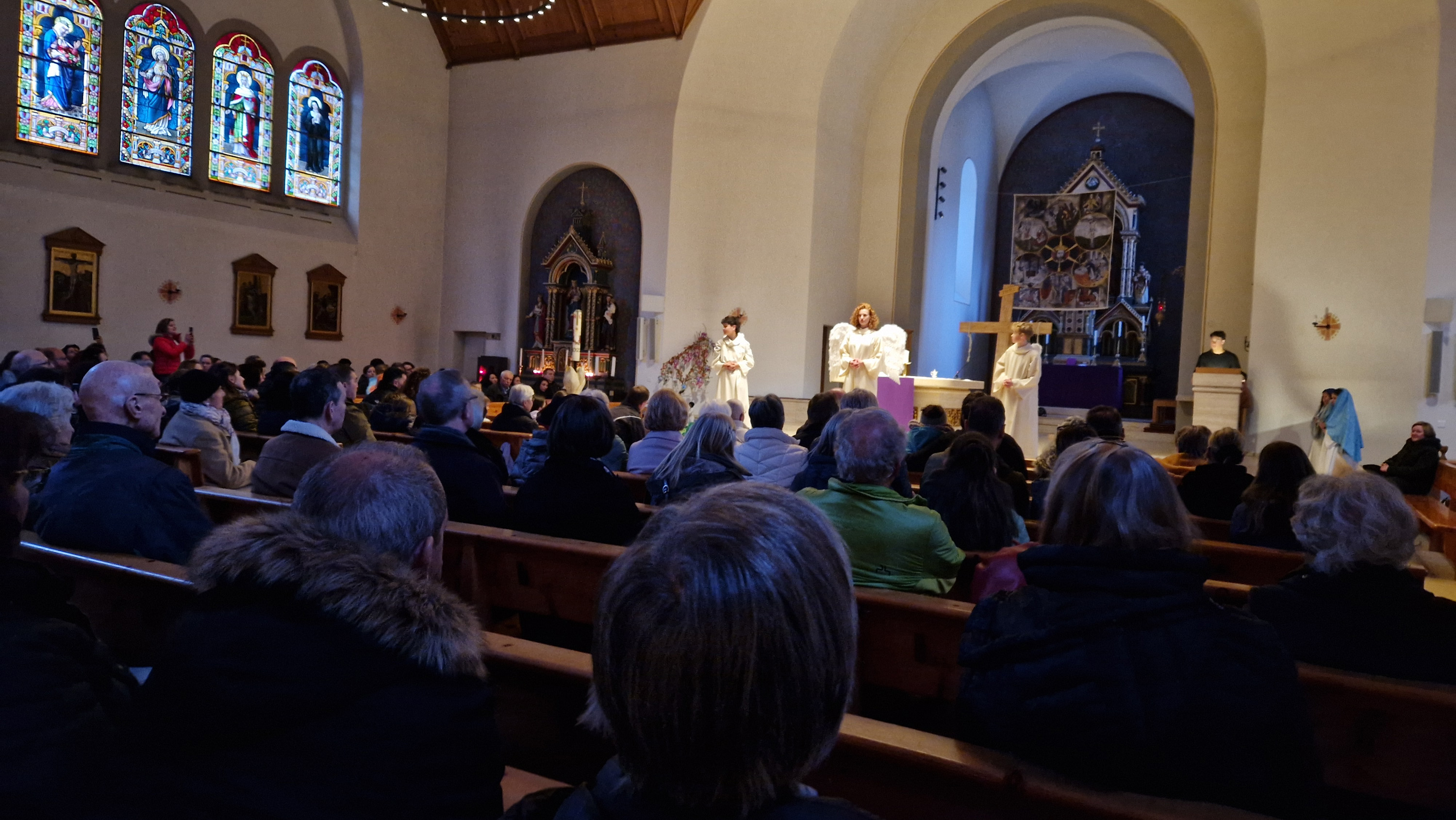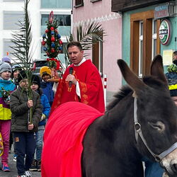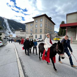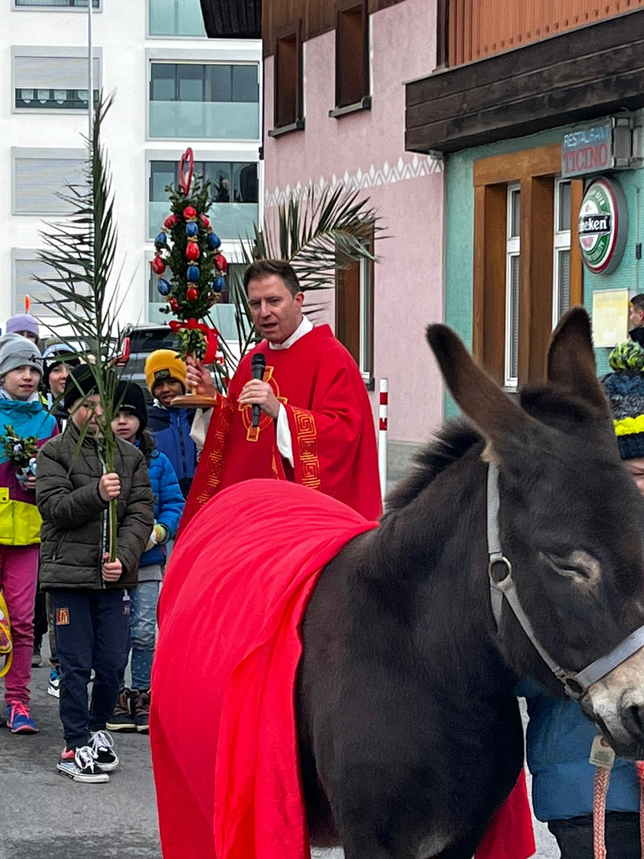 Zahlreiche Kinder, Jugendliche, Familien, Einheimische und Gäste nahmen bei der farbenfrohen Palmprozession teil, die von zwei herzigen Eseli mit Clemens Niederee als Jesusdarsteller angeführt wurde und zur Familienmesse in die übervolle Marienkirche führte. Am Abend führten 40 Jugendliche nochmals das ergreifende Passionsspiel auf, dass die Besucher inspirierend und bewundernswert auf Ostern einstimmte. So vorbereitet kann Ostern kommen.