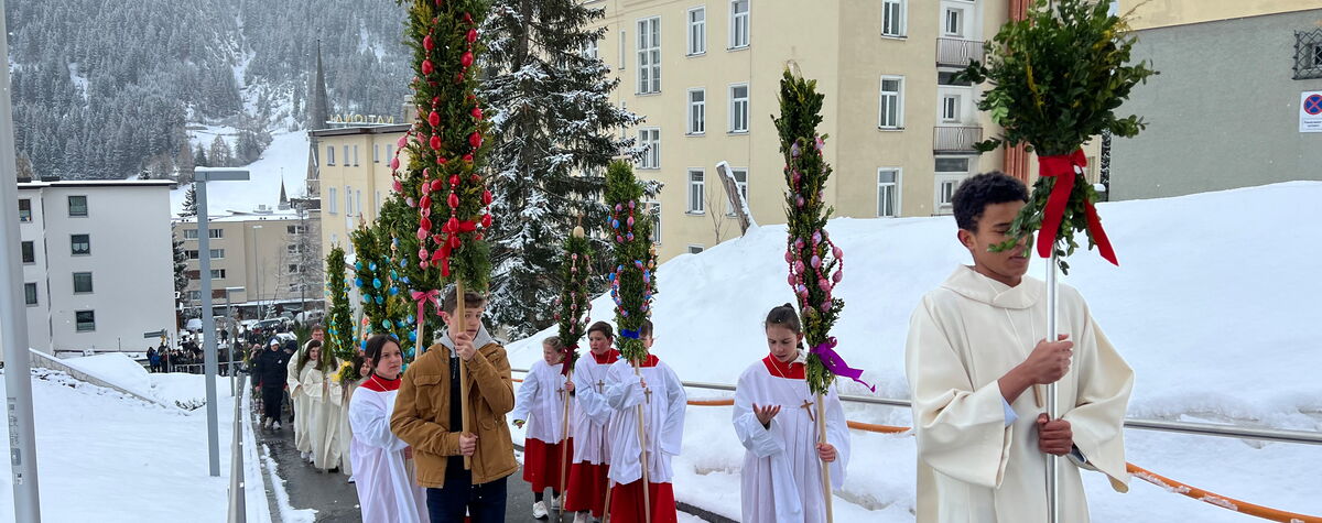 Am Palmsonntag, 2. April 2023, bereichert die katholische Kirche das kulturelle und religiöse Leben der Landschaft Davos und setzt mit grossem Engagement einen bunten Akzent zur Eröffnung der Karwoche. Mit der liturgischen Palmsonntagsfeier. Um 9.45 Uhr besammeln sich Kinder, Jugendliche, Familien, Einheimische und Gäste zur Eröffnung der Heiligen Woche vor dem Pfarreizentrum (Obere Str. 35). Nach der Palmsegnung beginnt die farbenfrohe Palmprozession am Bubenbrunnenplatz vorbei, die schon immer im Zeichen des Friedens Christi stand. Aufgrund der angespannten Weltlage hat die Friedensprozession in diesem Jahr, neben Friedensdemonstrationen, Kundgebungen und Friedensgebeten, eine besondere Bedeutung. Angeführt von zwei Eseli der Familie Weber, begleitet von Luis Pfister aus Monstein und dem Jesusdarsteller Clemens Niederee aus Davos Dorf, ziehen Alt und Jung mit ihren selbstgebastelten Palmen zur Marienkirche, wo dann gegen 10.15 Uhr die Familien-Kinder-Messe gefeiert wird; für die Kleinen mit einer eigenen kindgerechten Feier durch das Familienteam der Pfarrei. Am Ende der Eucharistiefeier bekommen alle kleinen und grossen Palmenträger eine frisch gebackene Palmbrezel geschenkt.
