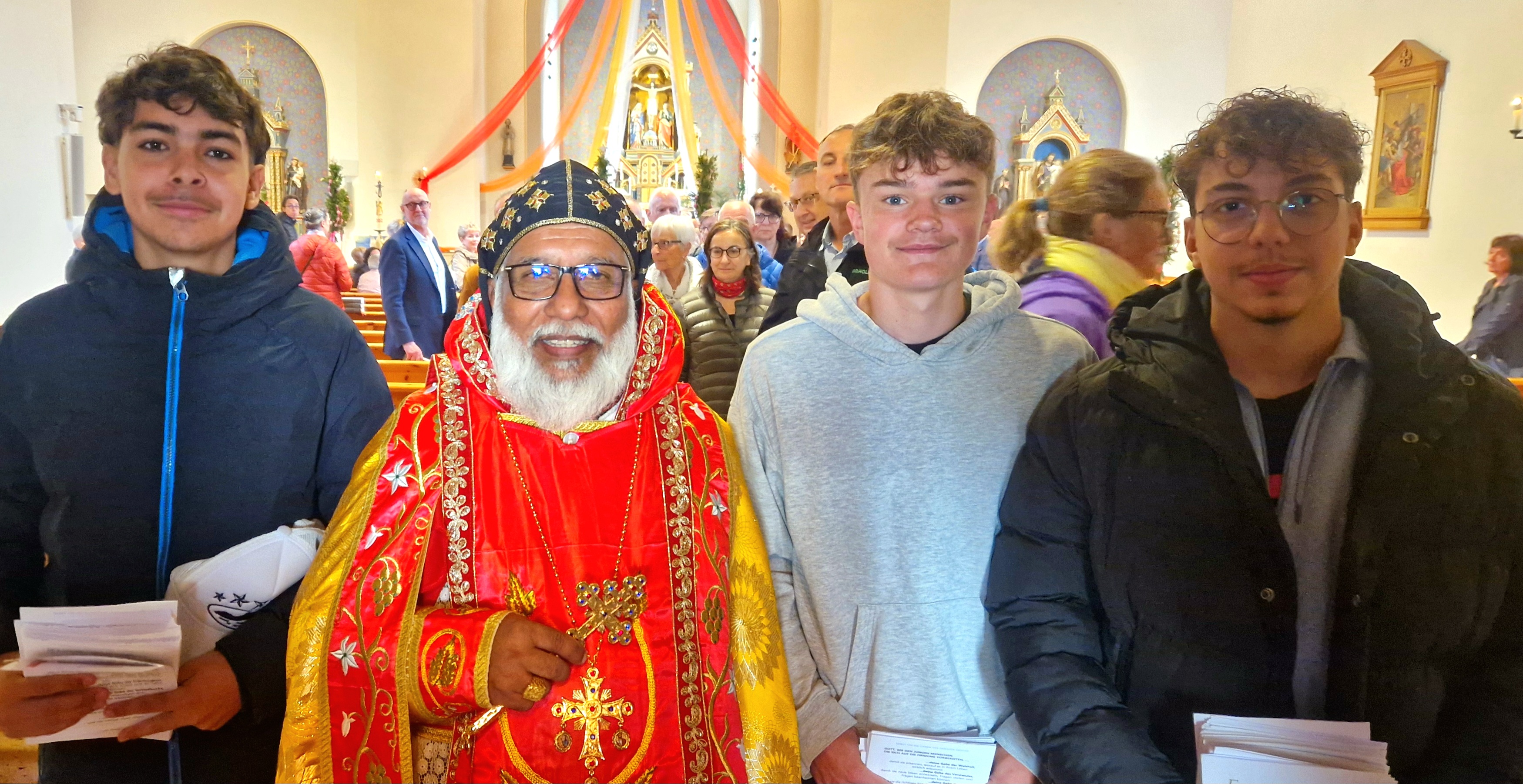 Zahlreiche Gläubige, darunter viele Ministranten und Firmlinge, feierten das Geburtsfest der Kirche und liessen sich vom Pfingstgeheimnis inspirieren. "In einer Zeit des zunehmenden Un-Geistes brauche die Welt mehr heiligen Geist, damit die globalen Herausforderungen der einen Menschheitsfamilie bewältigt werden können", betonte der Kardinal. "Wenn jeder bei sich selbst beginne, dann verbreite sich Friede, Glaube, Hoffnung und Liebe wie eine Kettenreaktion und der gute Geist kehre in Familien, Gesellschaft und Kirche zurück." Die Firmlinge luden die Gemeindemitglieder am Ende der Feier ein, für sie und ihre Familien in Vorbereitung auf die Firmung am 29. Juni 2025 zu beten. Dazu teilten sie selbst erarbeitete Gebetszettel aus. Lange nahm sich der hohe Gast, der erst noch bei der Wahl des neuen Papstes Leo im Konklave war Zeit, um mit Jung und Alt ins Gespräch zu kommen.