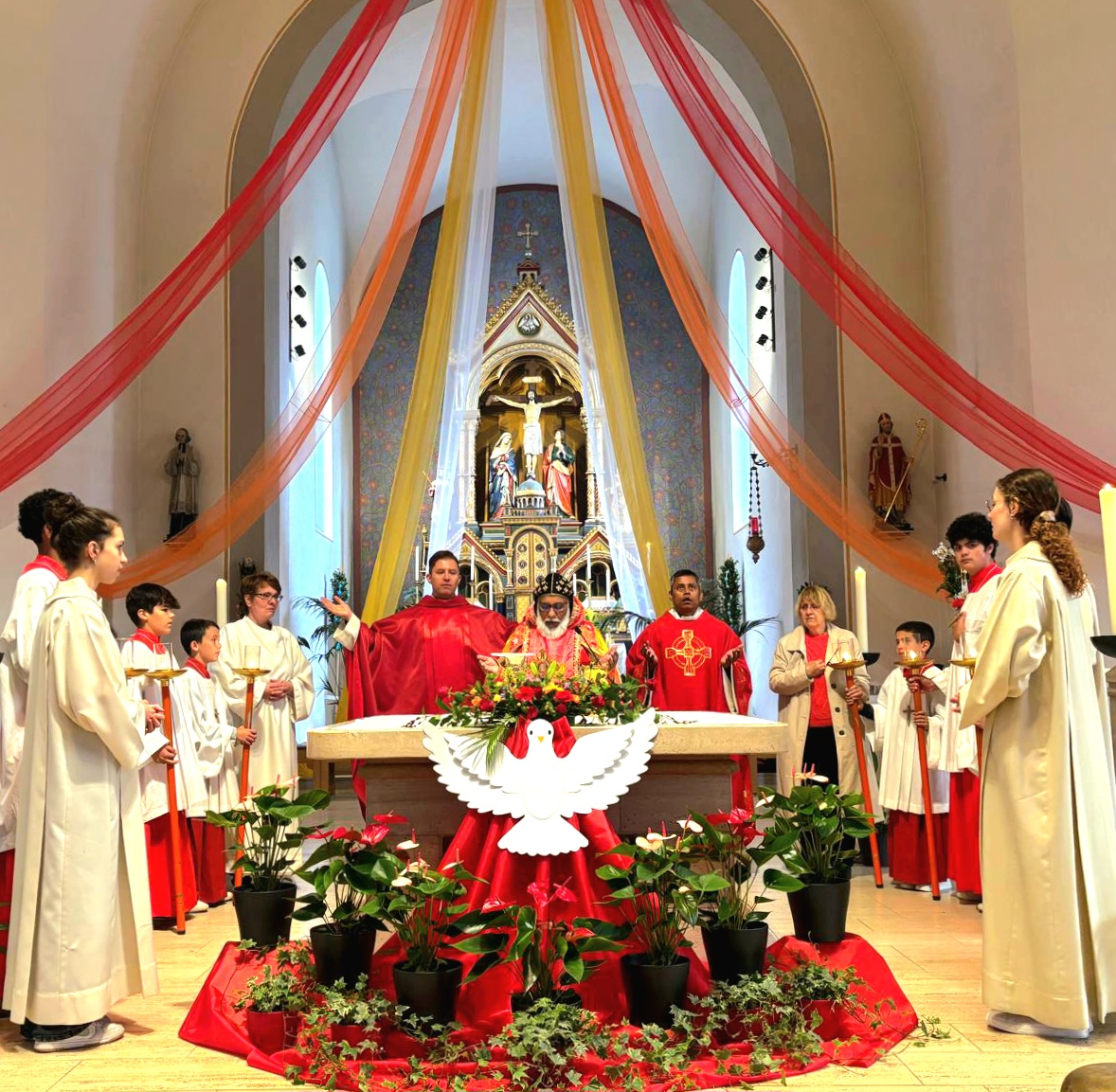 Besonders erfreut waren die Mitfeiernden vom imposanten pfingstlichen Kirchenschmuck, den Messmerin Sandra Schärli gekonnt und mit viel Arbeit vorbereitete.