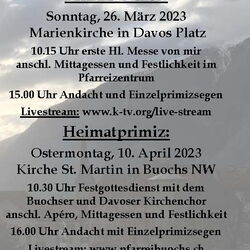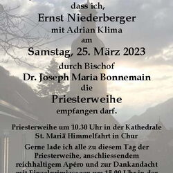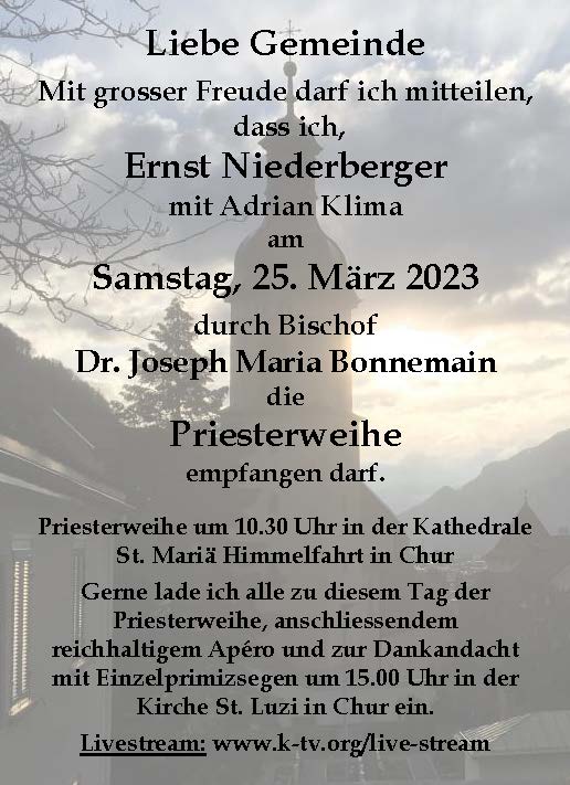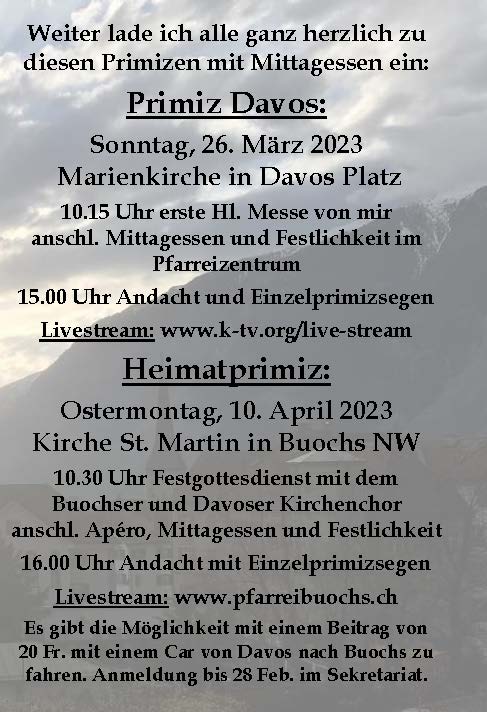 Am Sonntag 26. März darf ich in der Marienkirche Davos um 10.15 Uhr meine erste Hl. Messe, die Primiz, feiern. Alle sind ganz herzlich dazu eingeladen. Die Primiz wird live im K-TV übertragen. Anschliessend darf im Pfarreizentrum gemeinsam mit einem feinen Mittagessen weitergefeiert werden, bevor um 15.00 Uhr in der Kirche der spezielle Einzelsegen, der sogenannte Primizsegen, von mir durch Handauflegung und Segen gespendet wird. Ich freue mich auf alle, die mit mir mitfeiern.