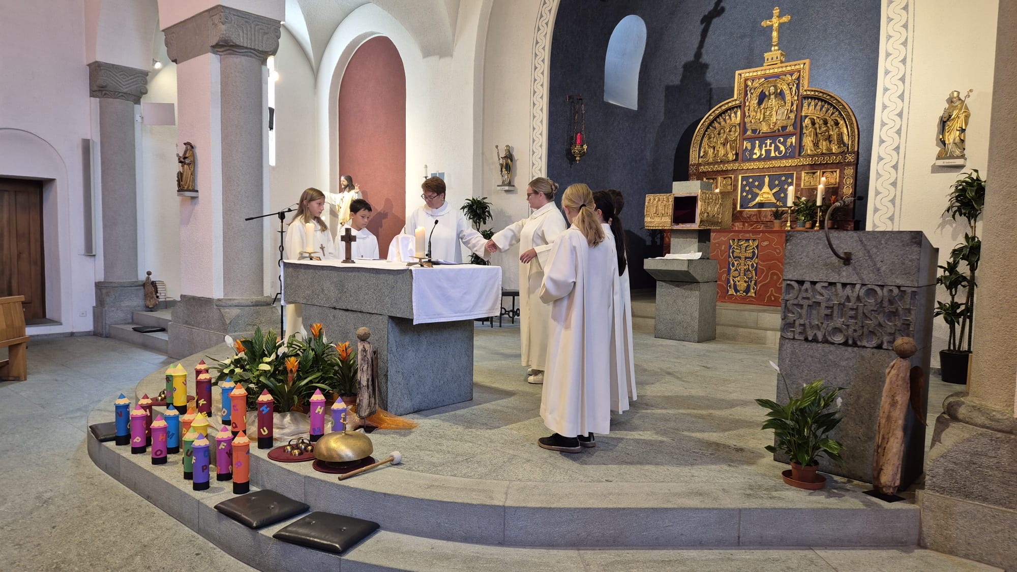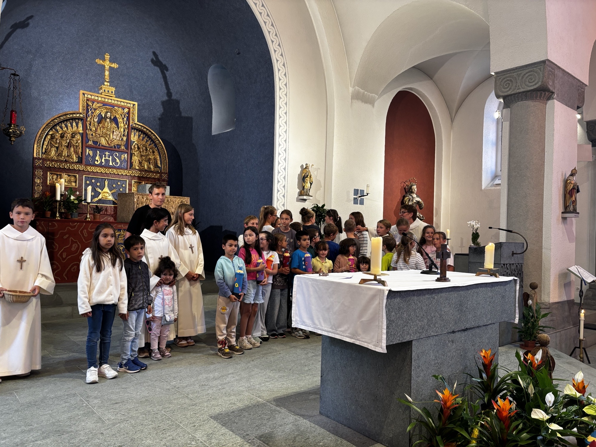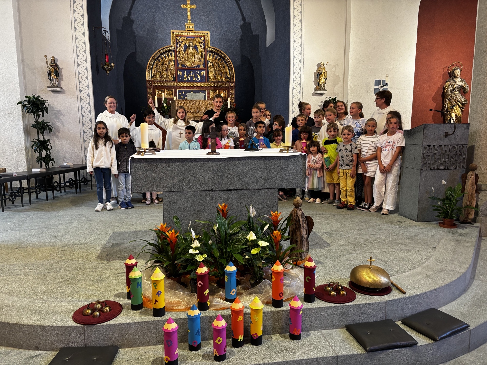 Am Samstag, 16. August, fand der diesjährige Schuleröffnungsgottesdienst in der Herz-Jesu Kirche statt. Verantwortet und gestaltet wurde dieser von Petra Homberger, Sandra Schärli und Monica Wioland. Sie schufen einen kindgerechten und zugleich kurzweiligen Rahmen, in dem fröhliche Elemente wie die „Seifenblasenbriefe“ als besondere Botschafter mit besinnlichen Texten und gemeinsamen Gebeten verbunden wurden. So entstand ein Gottesdienst, der sowohl Nachdenklichkeit als auch Leichtigkeit vermittelte. Musikalisch umrahmt wurde die Feier von Marco Schneider an der Orgel. Die Erstklässlerinnen und Erstklässler wurden mit einem kleinen Geschenk in der Gemeinschaft willkommen geheissen und erhielten zudem einen persönlichen Einzelsegen, der sie für den neuen Lebensabschnitt stärken soll. Nach dem Gottesdienst bot die Pfarrwiese bei strahlendem Sonnenschein den idealen Rahmen, um bei Hotdogs und Getränken in fröhlicher Runde zusammenzubleiben und das neue Schuljahr einzuläuten.