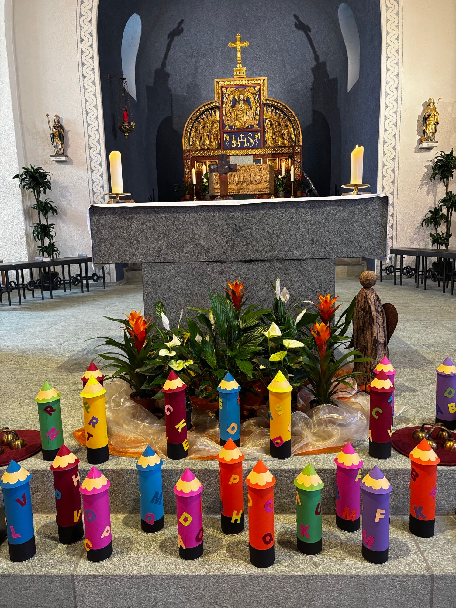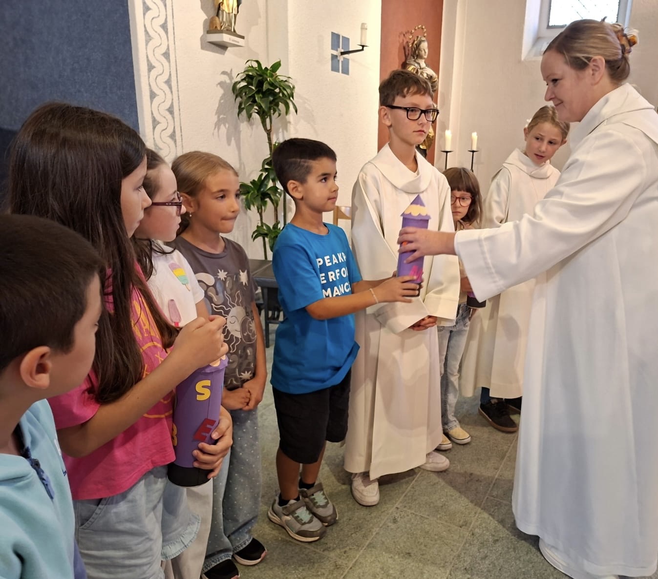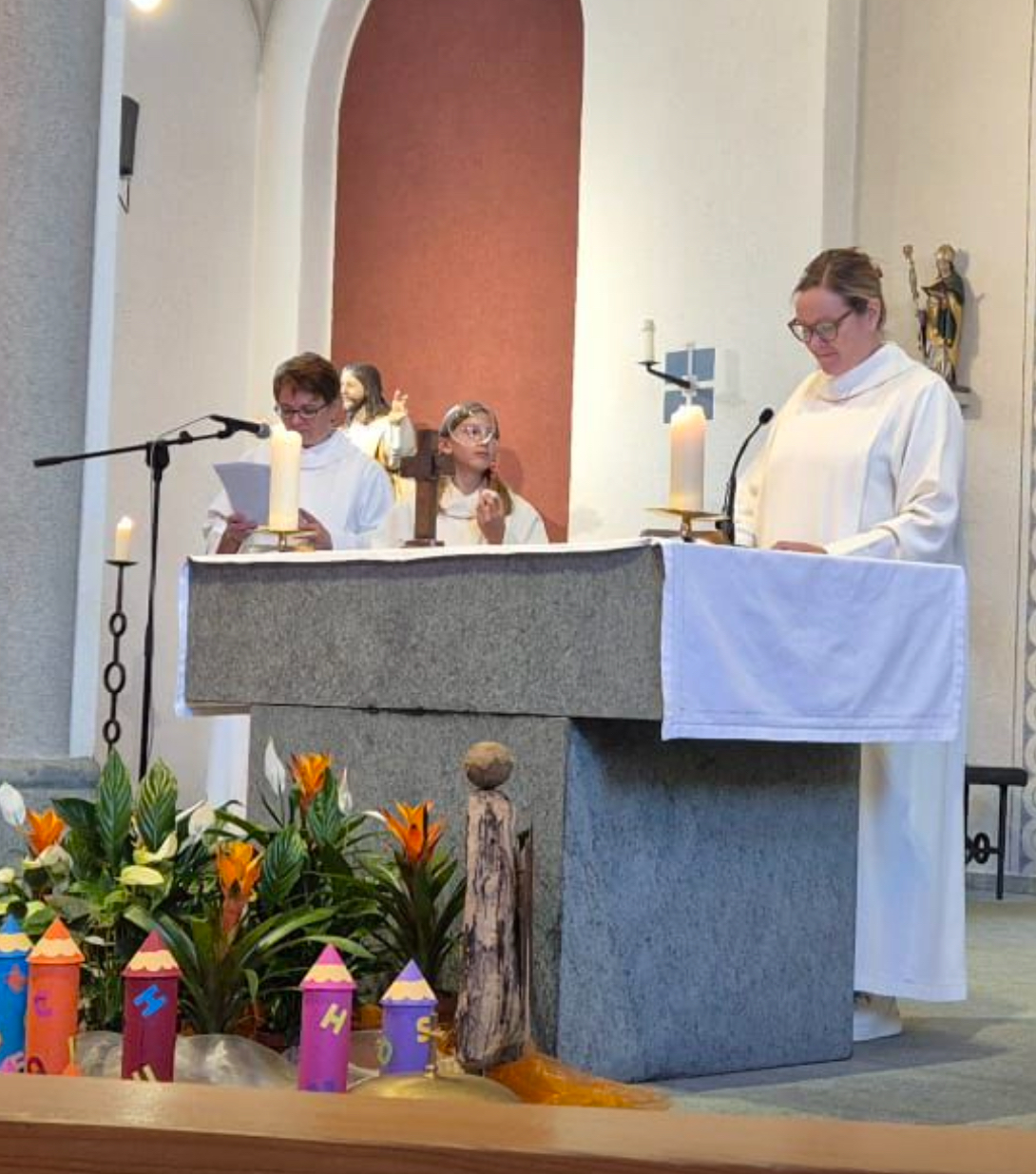 Am Samstag, 16. August, fand der diesjährige Schuleröffnungsgottesdienst in der Herz-Jesu Kirche statt. Verantwortet und gestaltet wurde dieser von Petra Homberger, Sandra Schärli und Monica Wioland. Sie schufen einen kindgerechten und zugleich kurzweiligen Rahmen, in dem fröhliche Elemente wie die „Seifenblasenbriefe“ als besondere Botschafter mit besinnlichen Texten und gemeinsamen Gebeten verbunden wurden. So entstand ein Gottesdienst, der sowohl Nachdenklichkeit als auch Leichtigkeit vermittelte. Musikalisch umrahmt wurde die Feier von Marco Schneider an der Orgel. Die Erstklässlerinnen und Erstklässler wurden mit einem kleinen Geschenk in der Gemeinschaft willkommen geheissen und erhielten zudem einen persönlichen Einzelsegen, der sie für den neuen Lebensabschnitt stärken soll. Nach dem Gottesdienst bot die Pfarrwiese bei strahlendem Sonnenschein den idealen Rahmen, um bei Hotdogs und Getränken in fröhlicher Runde zusammenzubleiben und das neue Schuljahr einzuläuten.