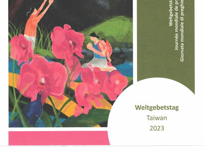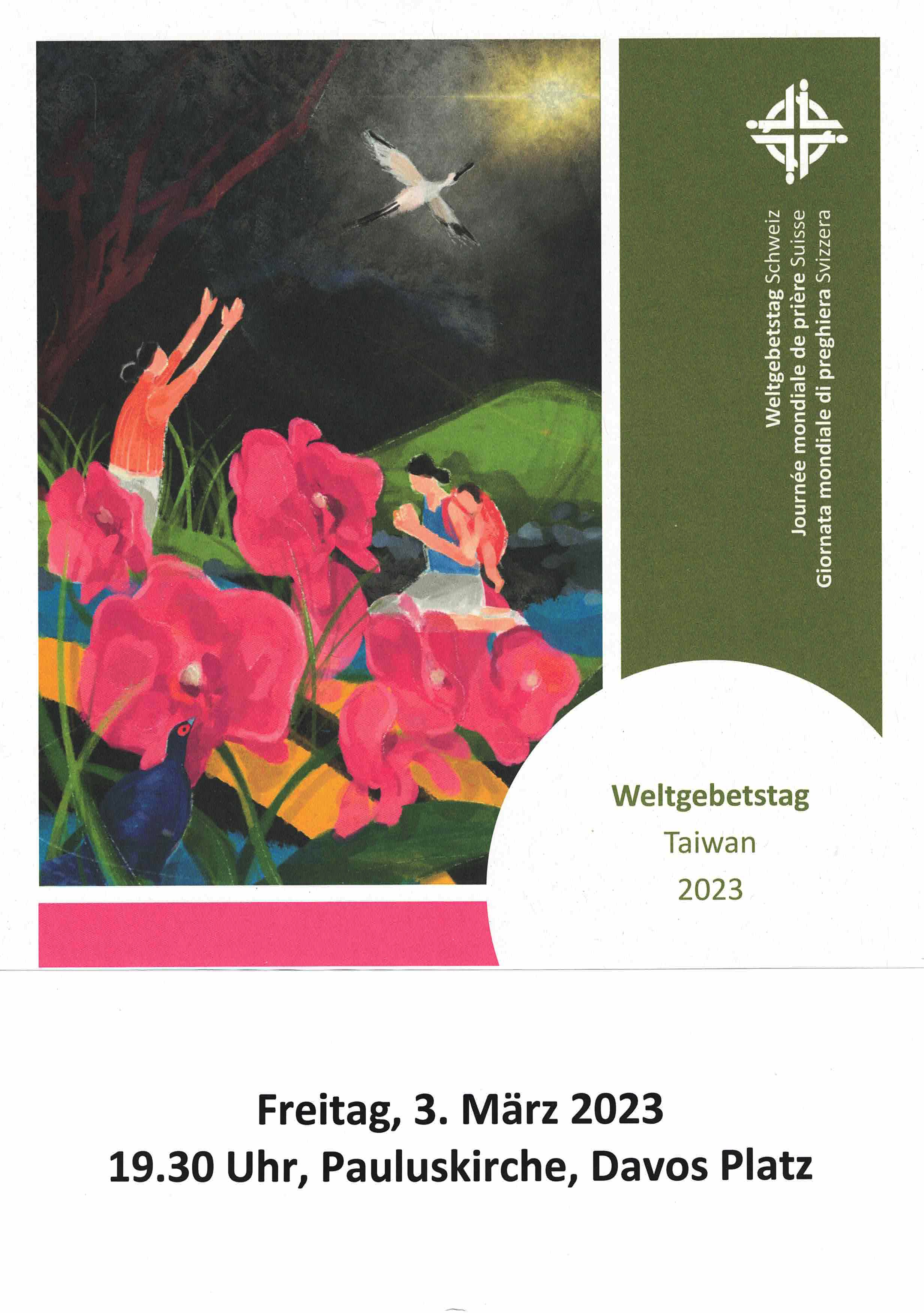 Im Titelbild drückt die junge Künstlerin Hui-Wen Hsiao ihren eigenen christlichen Glauben aus. Vor dem dunklen Hintergrund einer unsicheren Zukunft dominieren die roten Schmetterlingsorchideen, der Stolz Taiwans. Der Mikadofasan und der Schwarzgesichtlöffler, zwei typisch taiwanische, aber vom Aussterben bedrohte Tierarten, symbolisieren Zuversicht und Durchhaltewillen in schwierigen Zeiten. Die Frauen im Bild beten still oder blicken auf das Licht, das aus dem Dunkel leuchtet und die Rettung durch Christus verspricht. Anschliessend an den von Frauen aus verschiedenen Davoser Kirchen gestalteten Gottesdienst sind Sie herzlich eingeladen, bei Gebäck und Getränken, miteinander ins Gespräch zu kommen.