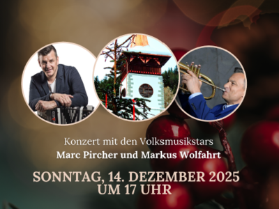 Markus Wolfahrt (Die Klostertaler) und Marc Pircher (Schlagerstar) gastieren am 14. Dezember 2025, um 17.00 Uhr in der Marienkirche.