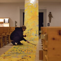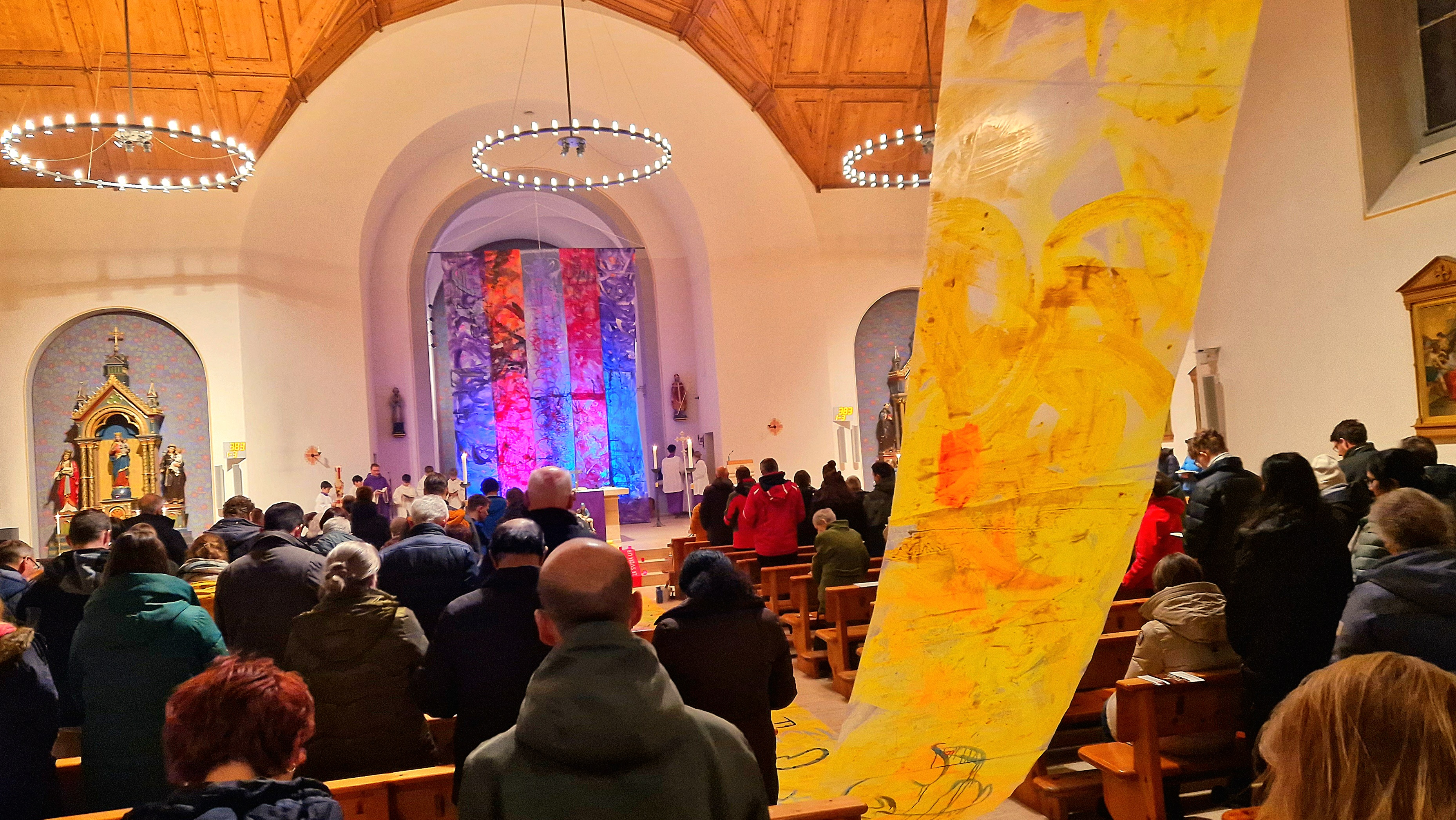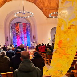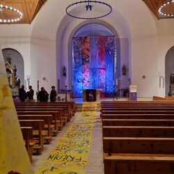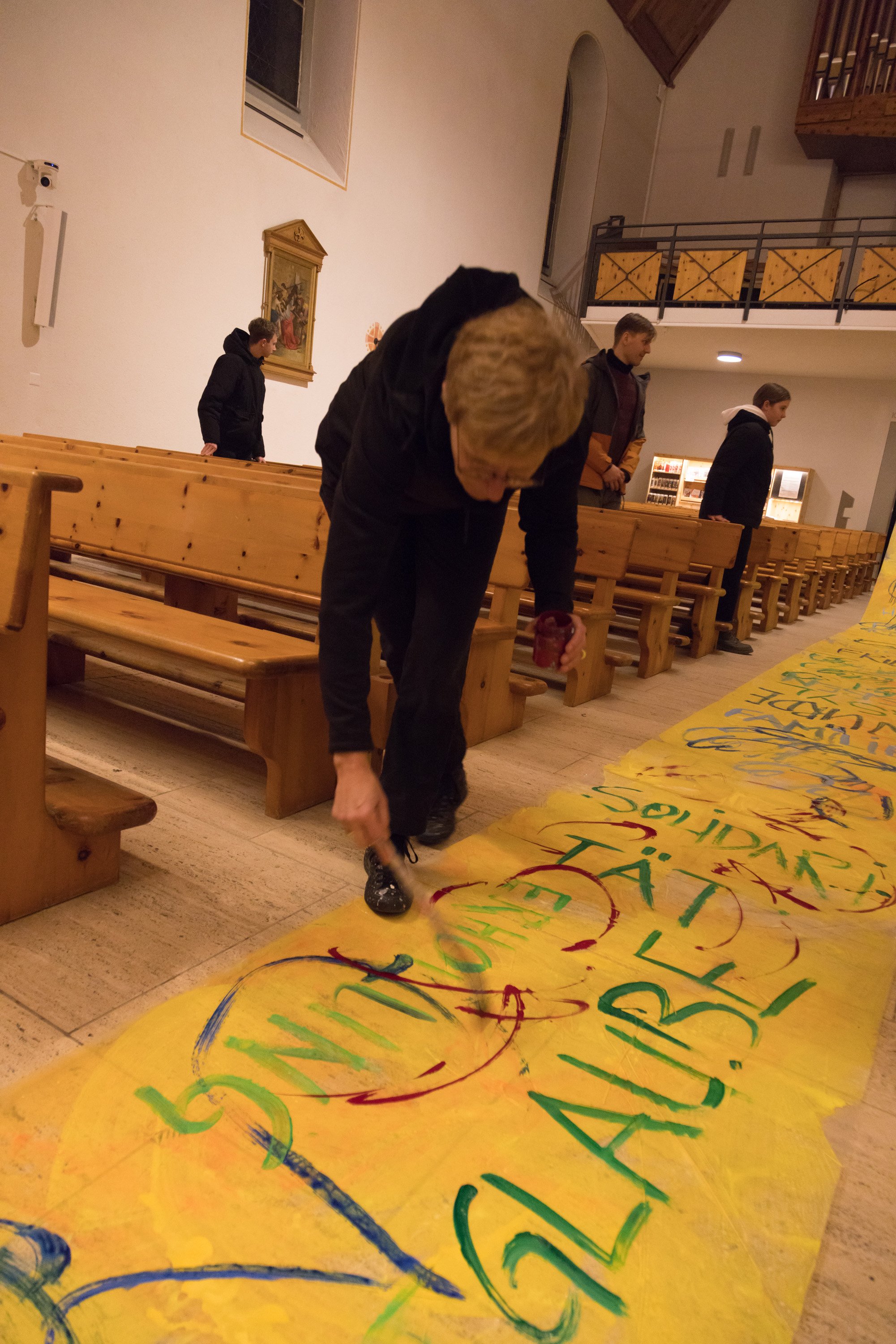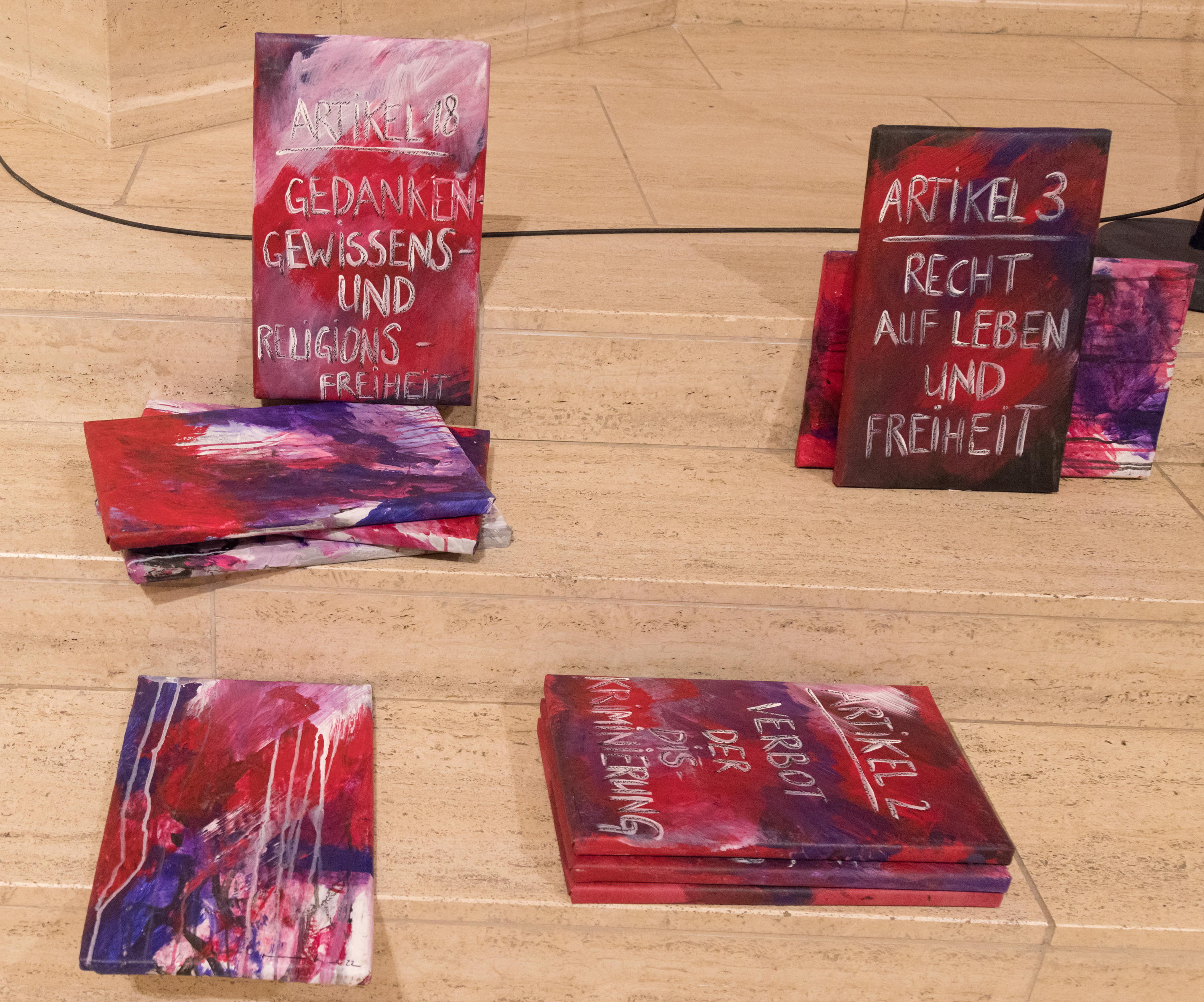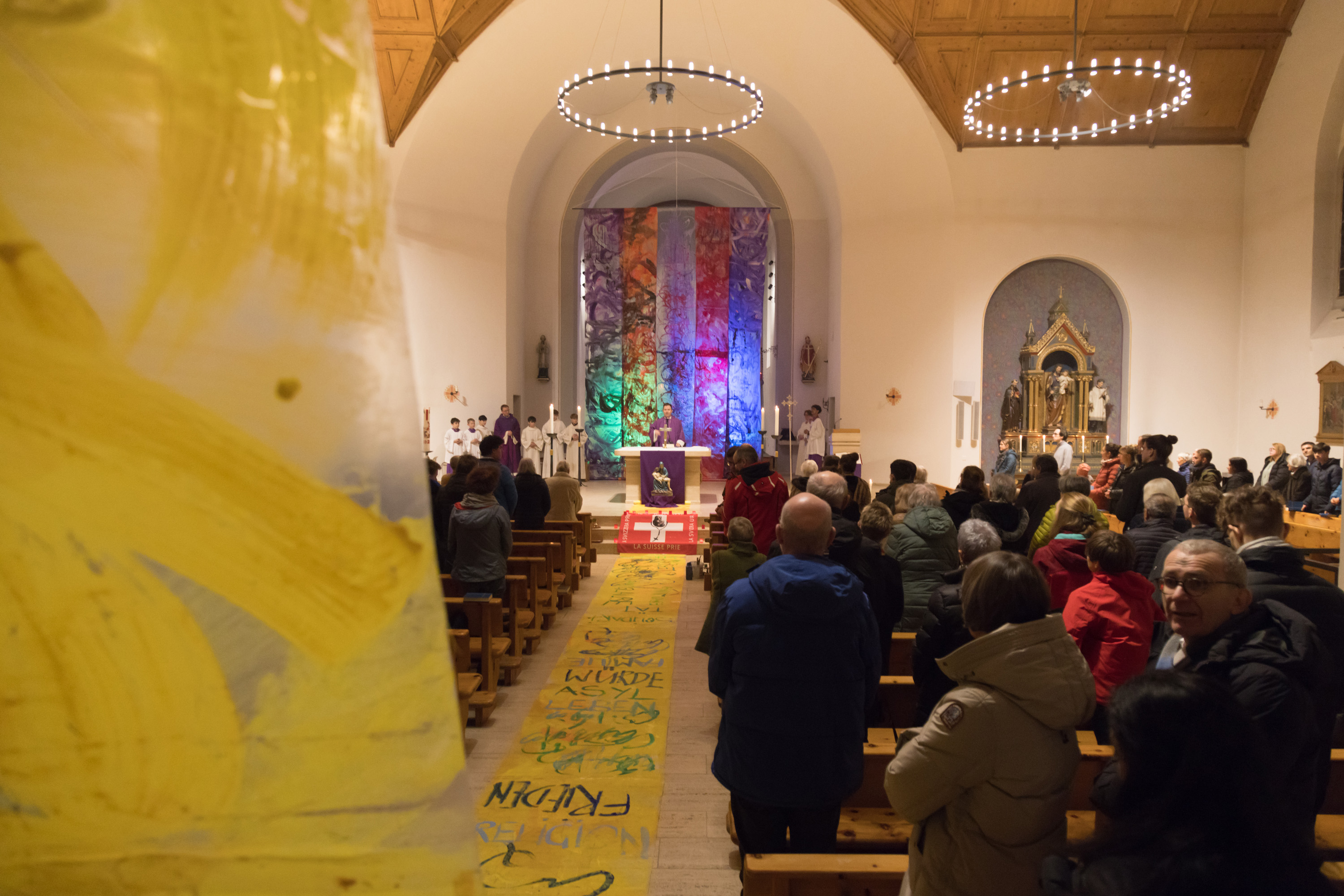 Es ist alte Tradition, dass von Aschermittwoch bis Karfreitag die Altäre verhüllt werden. Fasten mit allen Sinnen! Mit der in Salouf (Surses) aufgewachsenen Künstlerin Marianne Hollenstein wurde in diesem Jahr eine Kirchenraumkomposition entwickelt, die herausfordert und fordert: „EINFACH_MENSCH_SEIN“. Die international tätige Künstlerin befasst sich in ihrer Rauminstallation in der Marienkirche mit den Inhalten der 30 Menschenrechtsartikel - Allgemeine Erklärung der Menschenrechte vom 10. Dez. 1948 - in Bezug auf den Kirchenraum. Diese Menschenrechte, die ohne eine christliche Weltsicht so nie formuliert worden wären, sind aktueller denn je.