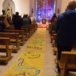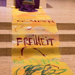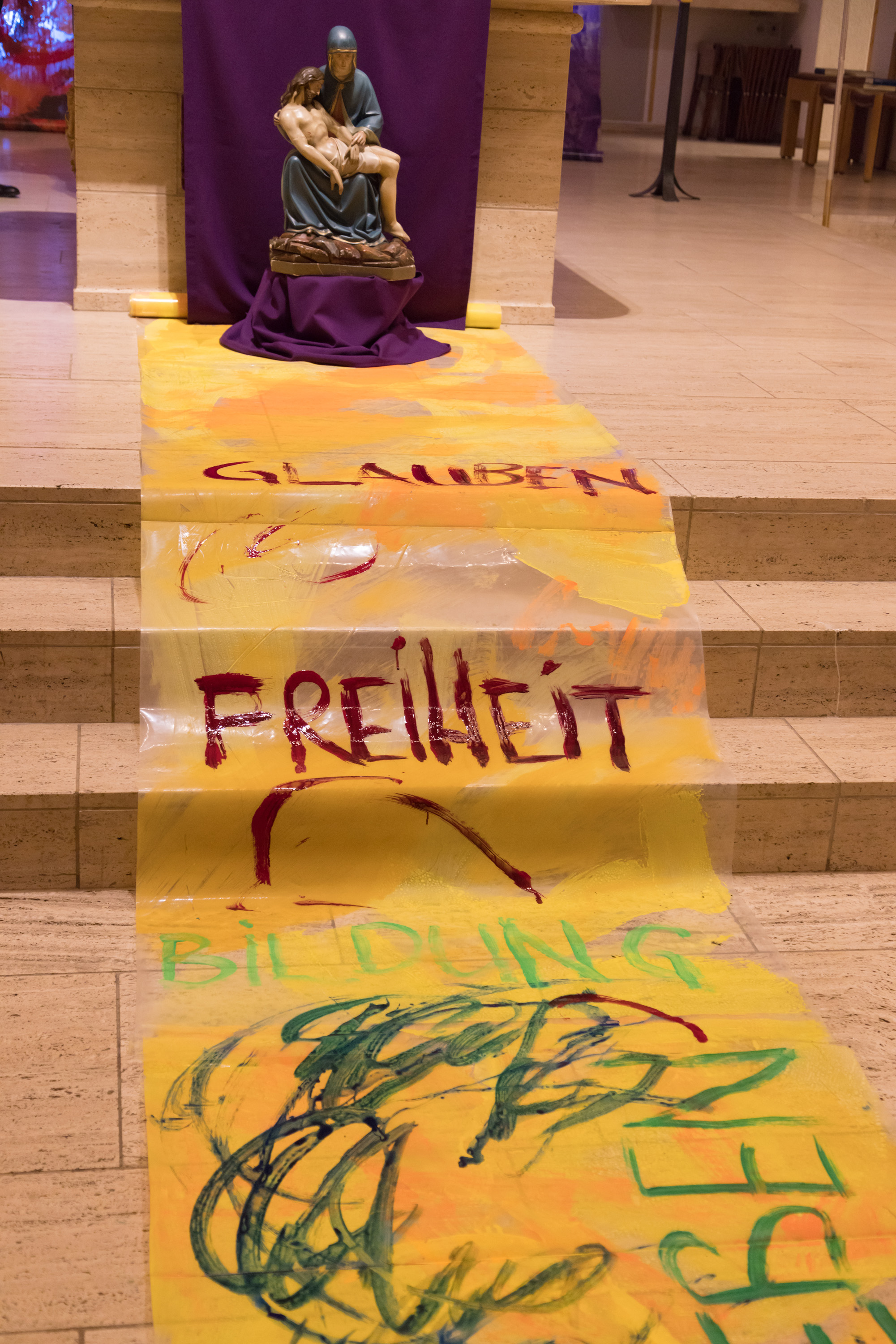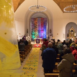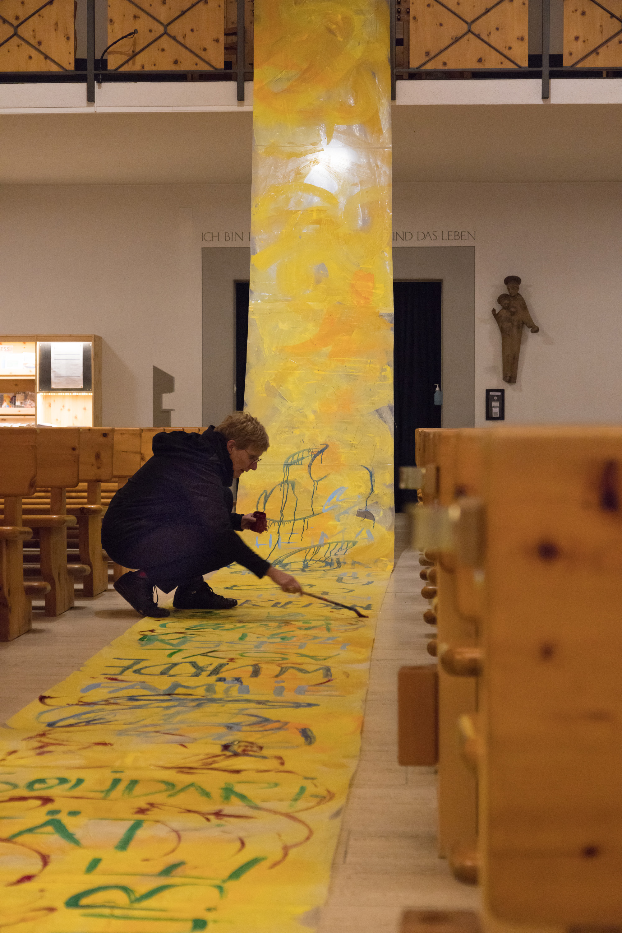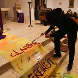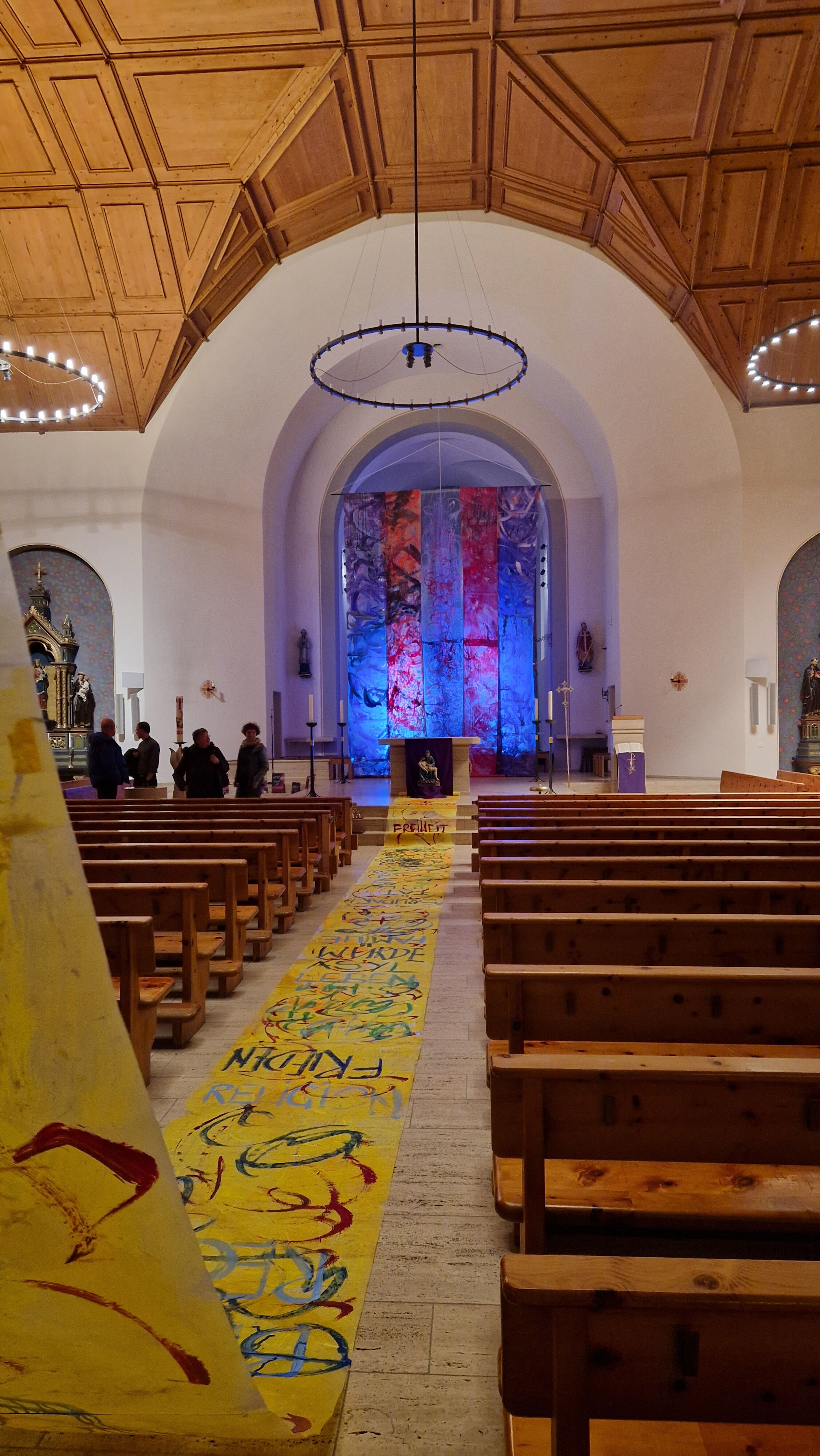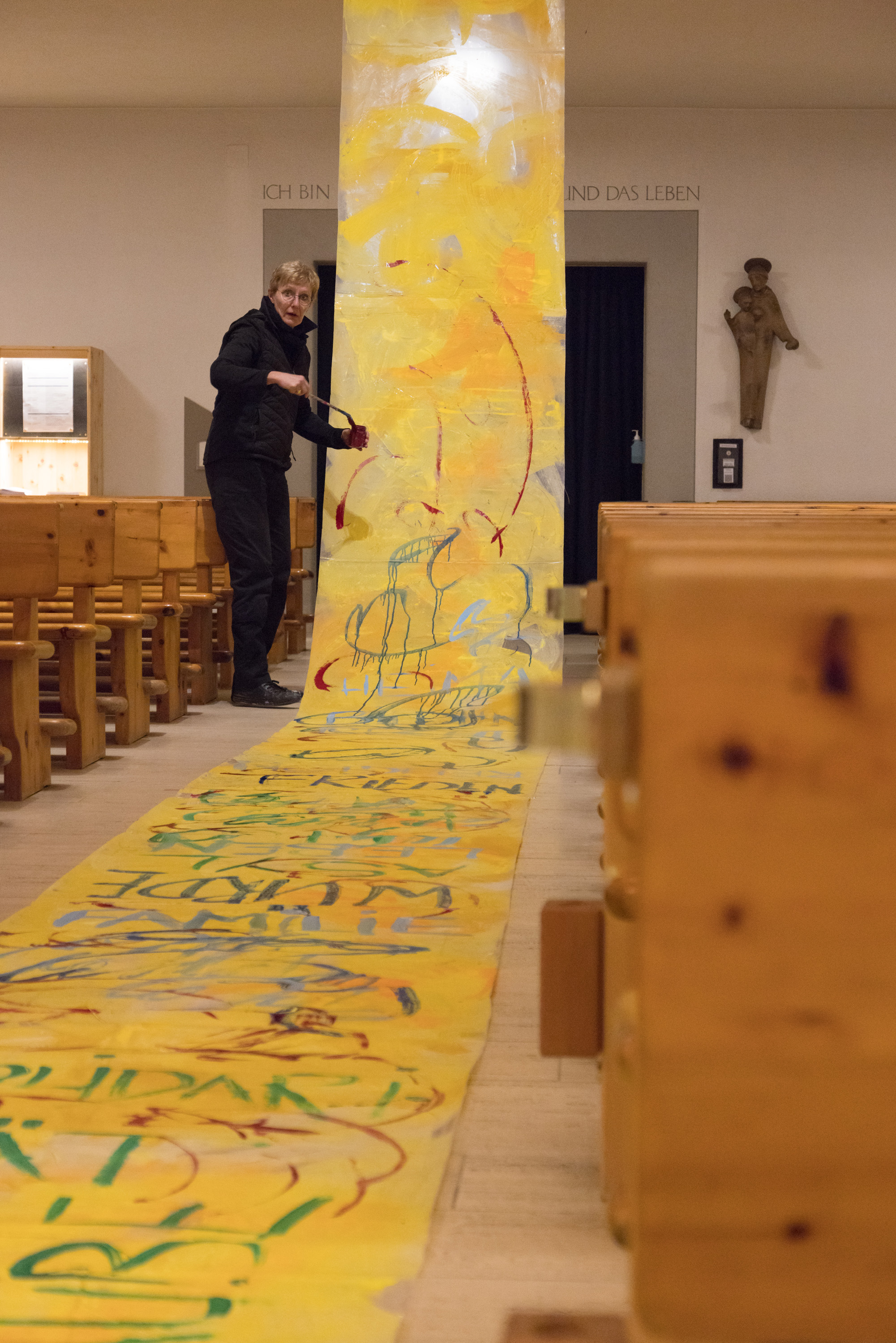 Es ist alte Tradition, dass von Aschermittwoch bis Karfreitag die Altäre verhüllt werden. Fasten mit allen Sinnen! Mit der in Salouf (Surses) aufgewachsenen Künstlerin Marianne Hollenstein wurde in diesem Jahr eine Kirchenraumkomposition entwickelt, die herausfordert und fordert: „EINFACH_MENSCH_SEIN“. Die international tätige Künstlerin befasst sich in ihrer Rauminstallation in der Marienkirche mit den Inhalten der 30 Menschenrechtsartikel - Allgemeine Erklärung der Menschenrechte vom 10. Dez. 1948 - in Bezug auf den Kirchenraum. Diese Menschenrechte, die ohne eine christliche Weltsicht so nie formuliert worden wären, sind aktueller denn je.