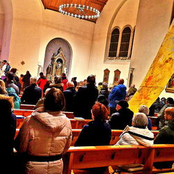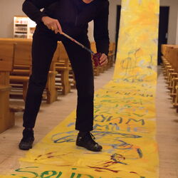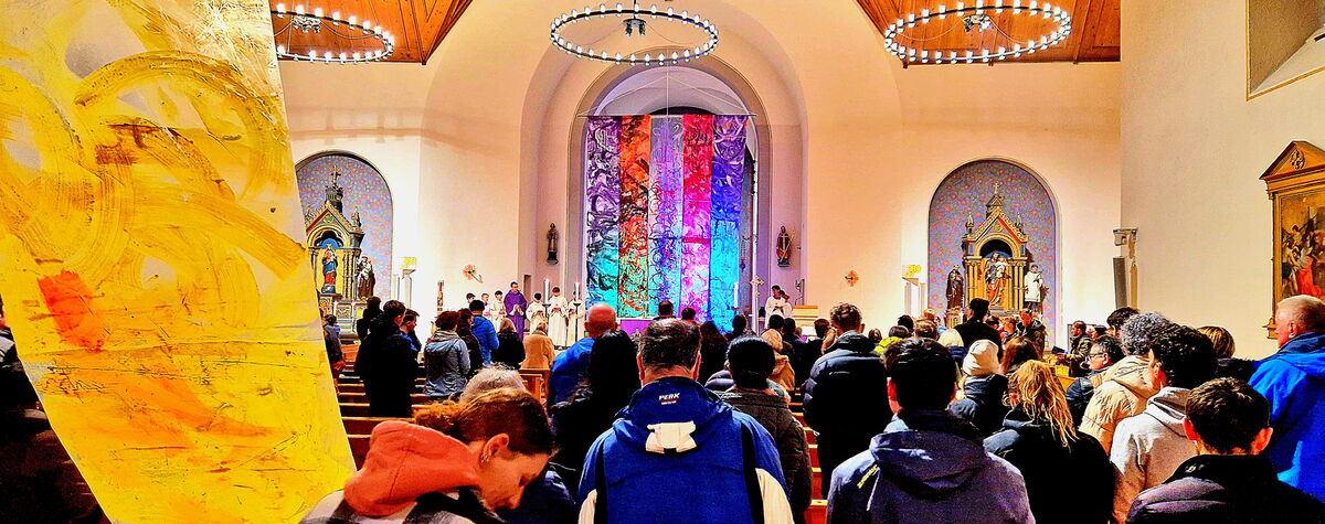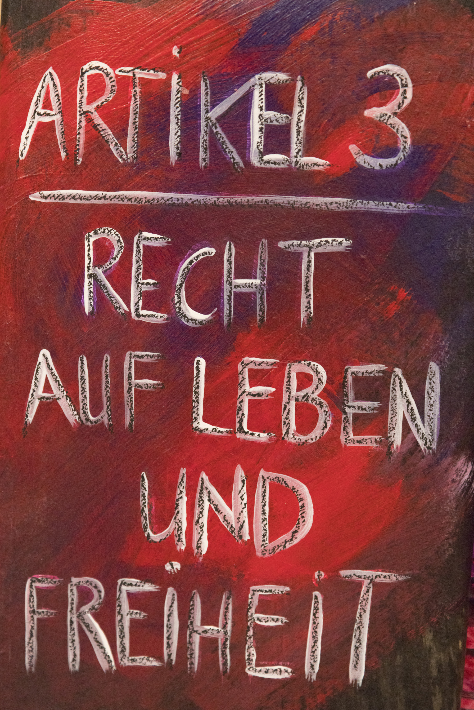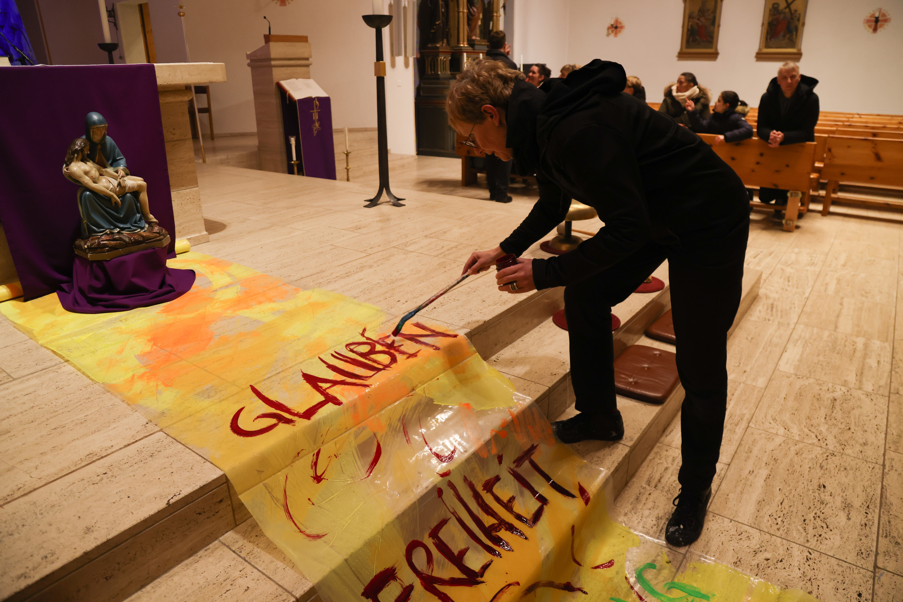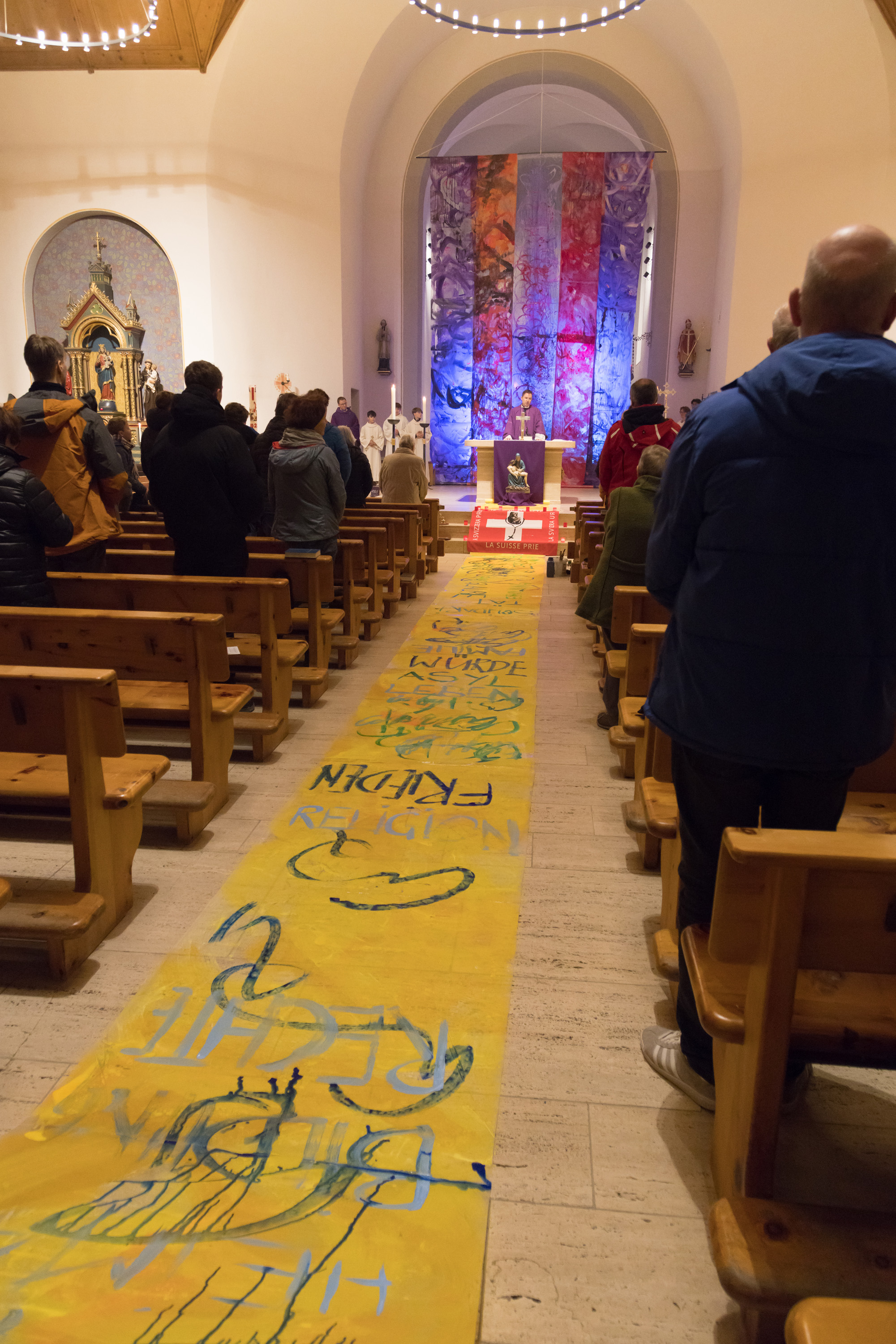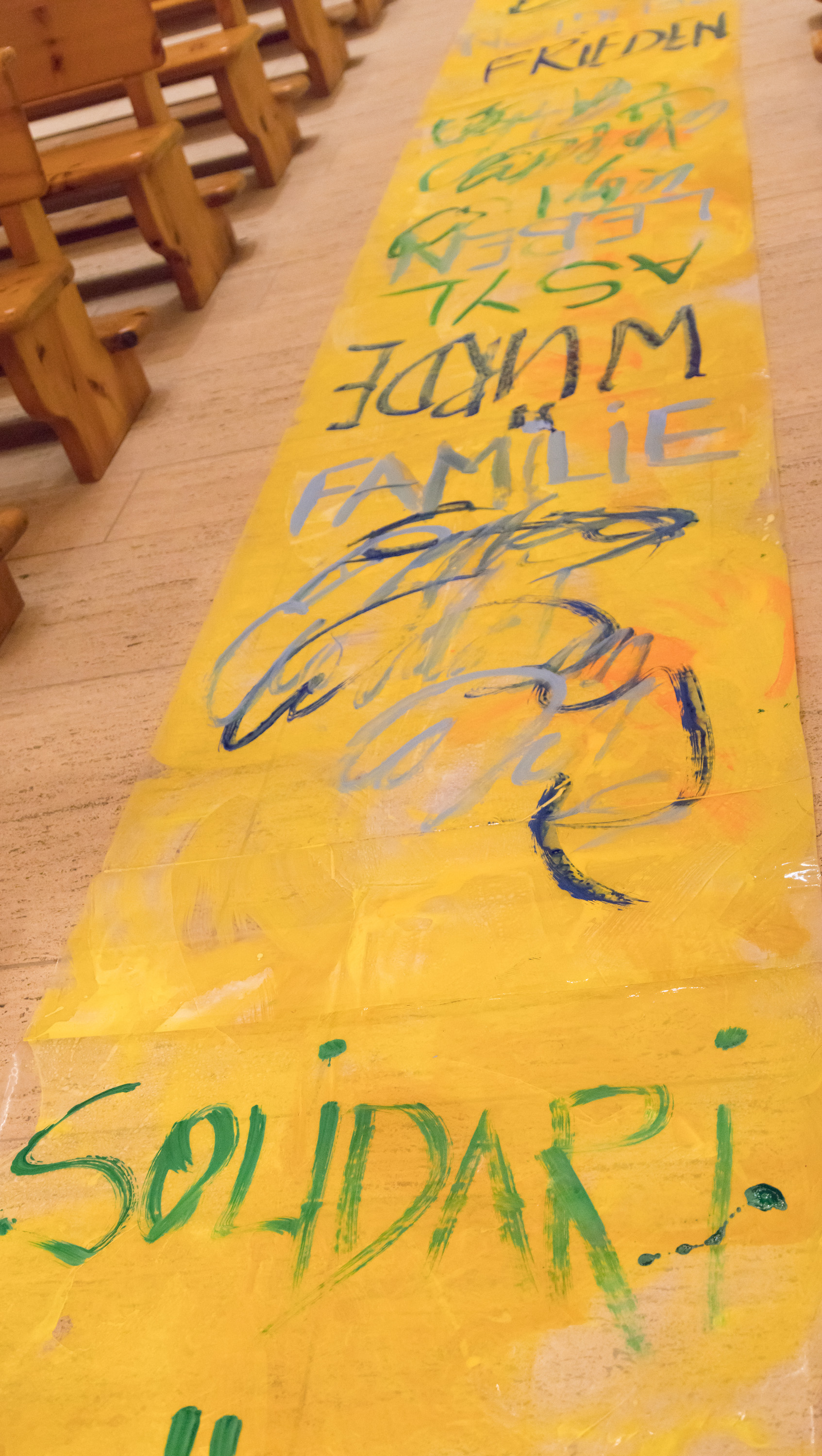 Es ist alte Tradition, dass von Aschermittwoch bis Karfreitag die Altäre verhüllt werden. Fasten mit allen Sinnen! Mit der in Salouf (Surses) aufgewachsenen Künstlerin Marianne Hollenstein wurde in diesem Jahr eine Kirchenraumkomposition entwickelt, die herausfordert und fordert: „EINFACH_MENSCH_SEIN“. Die international tätige Künstlerin befasst sich in ihrer Rauminstallation in der Marienkirche mit den Inhalten der 30 Menschenrechtsartikel - Allgemeine Erklärung der Menschenrechte vom 10. Dez. 1948 - in Bezug auf den Kirchenraum. Diese Menschenrechte, die ohne eine christliche Weltsicht so nie formuliert worden wären, sind aktueller denn je.