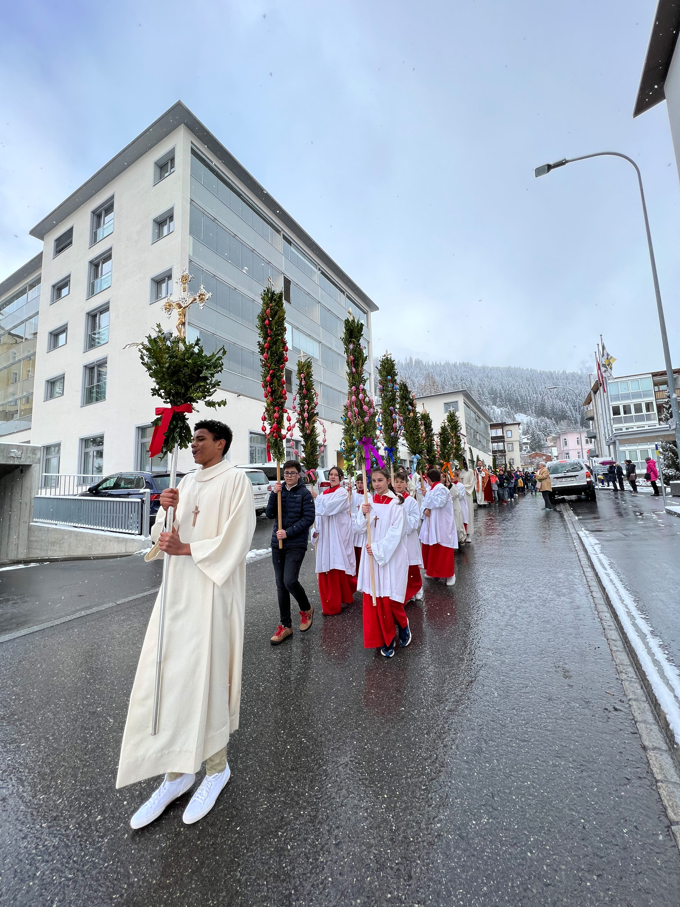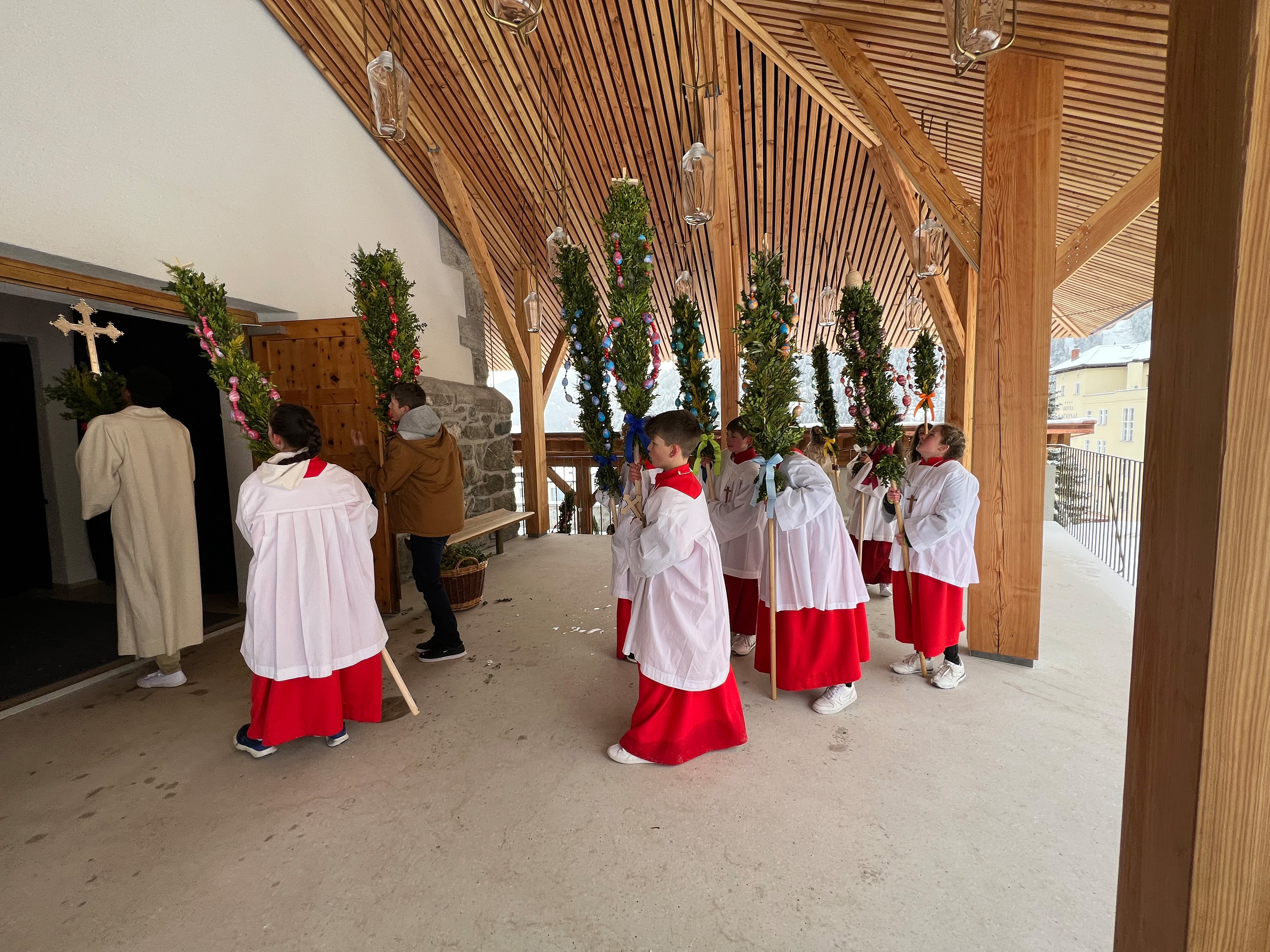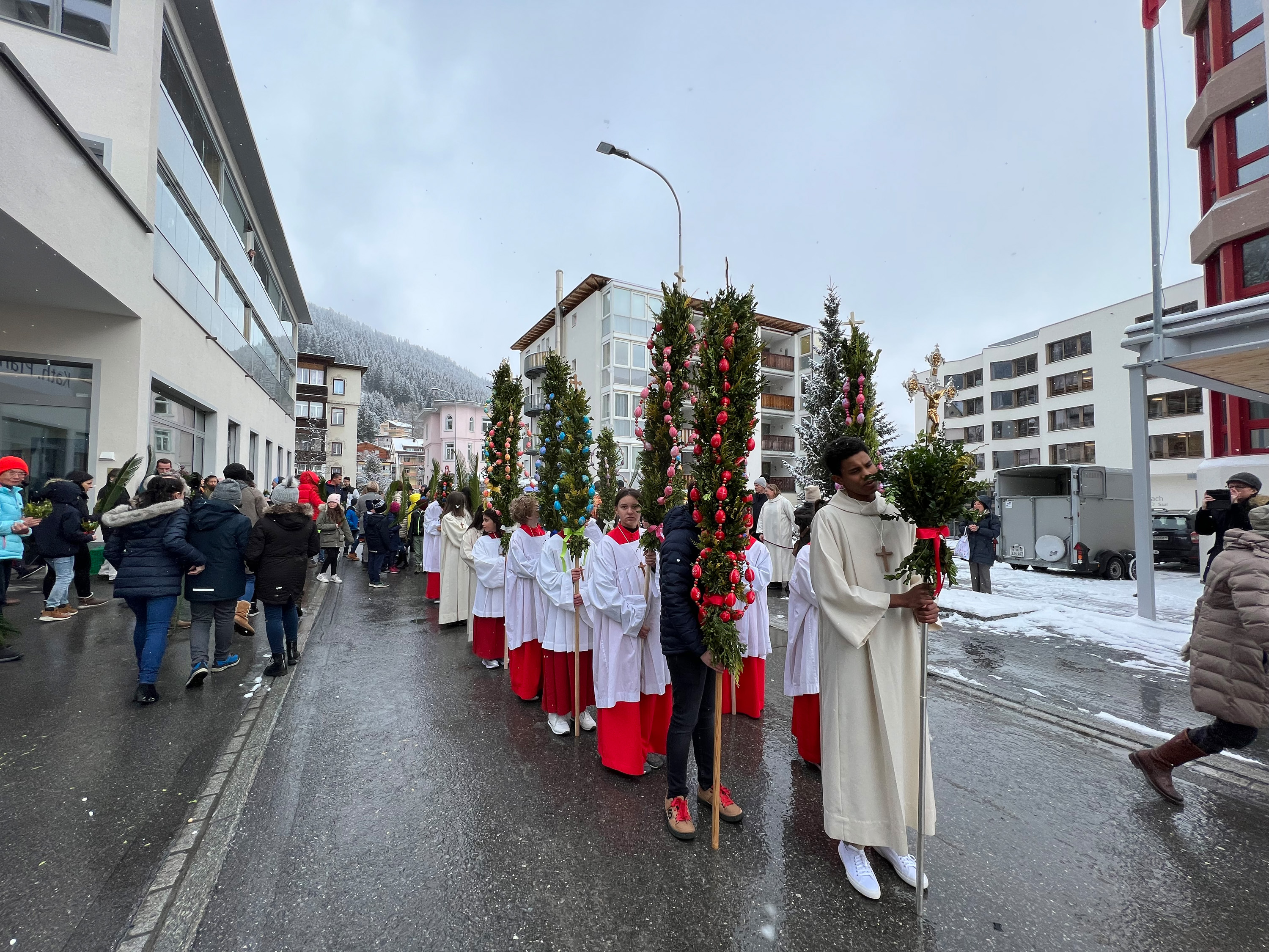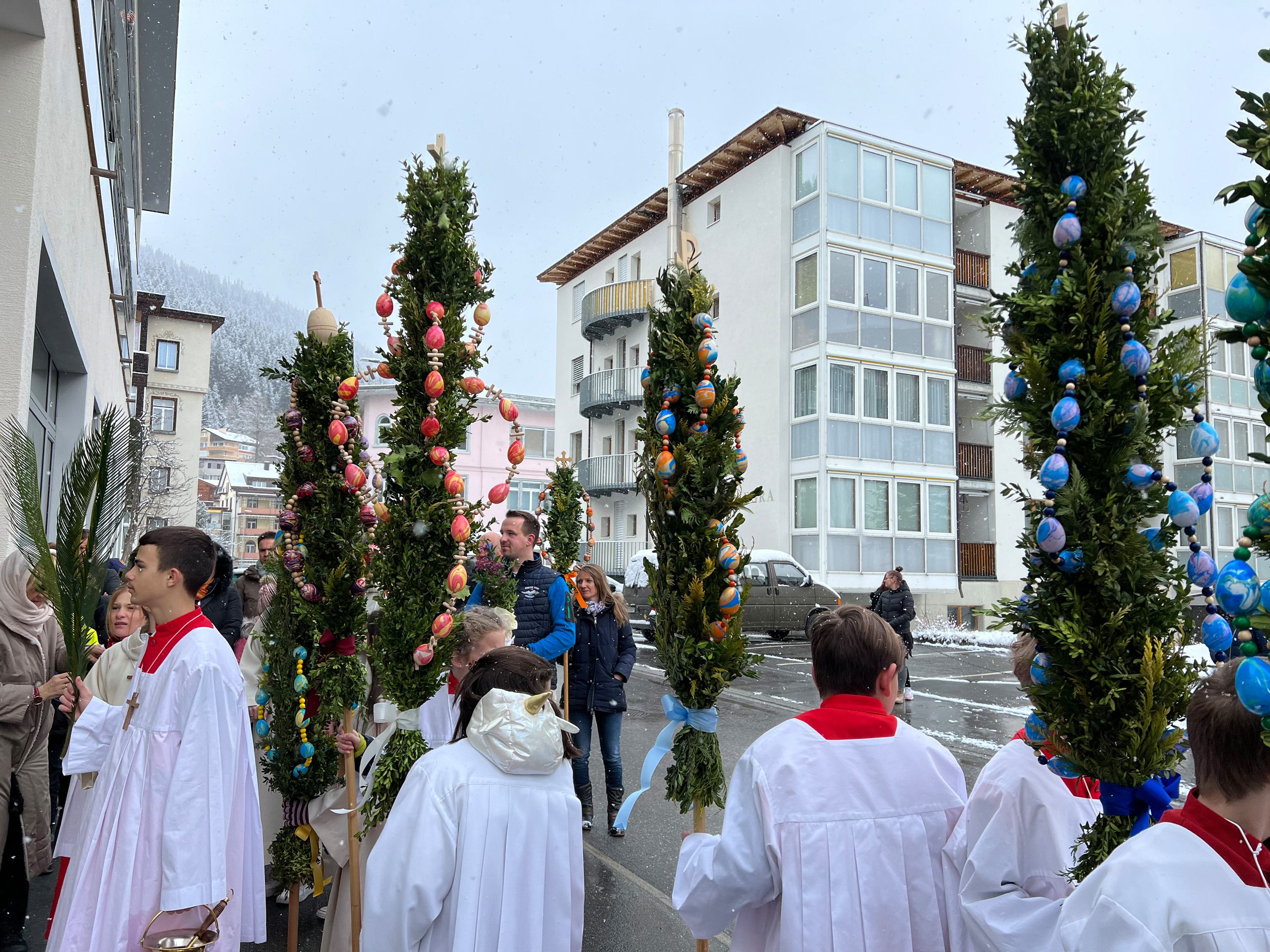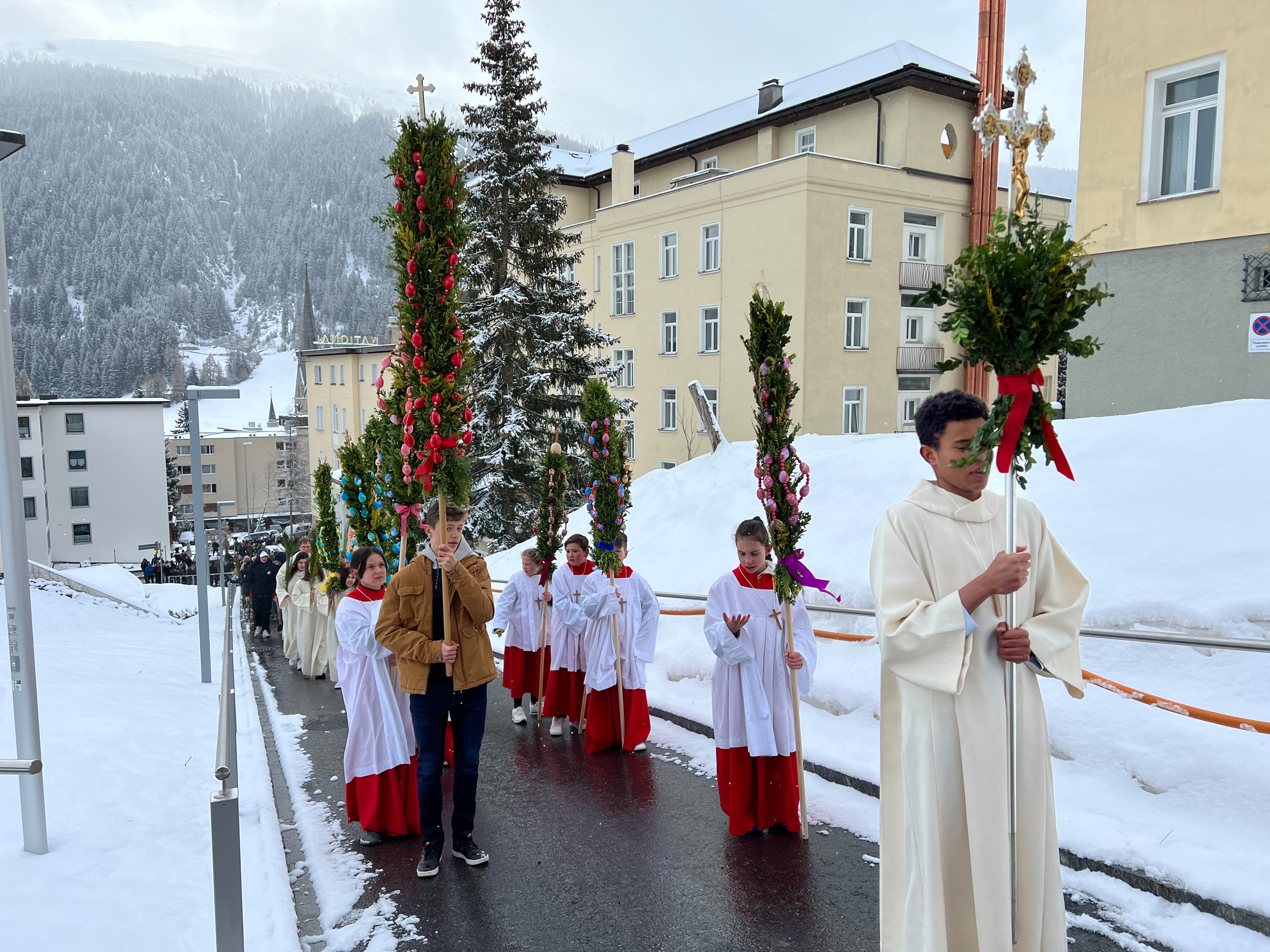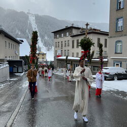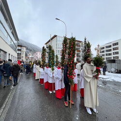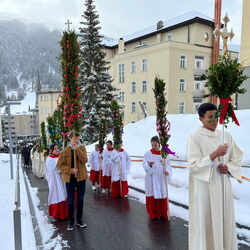 Farbenfrohe Palmgebinde, strahlende Gesichter, volle Kirchen: der Palmsonntag am vergangenen Wochenende lockte ausserordentlich viele Familien, Kinder, Jugendliche und Gläubige der katholischen Pfarrei Davos zur den drei Palmprozessionen und Festmessen. Alt und Jung konnten sich einstimmen auf das zentrale Geheimnis des christlichen Glaubens, das in der Heilige Woche mit dem Gründonnerstagabend, Karfreitag und Ostern (die Feier von Leiden, Tod und Auferstehung Jesu Christi) den Höhepunkt im Kirchenjahr erreicht.